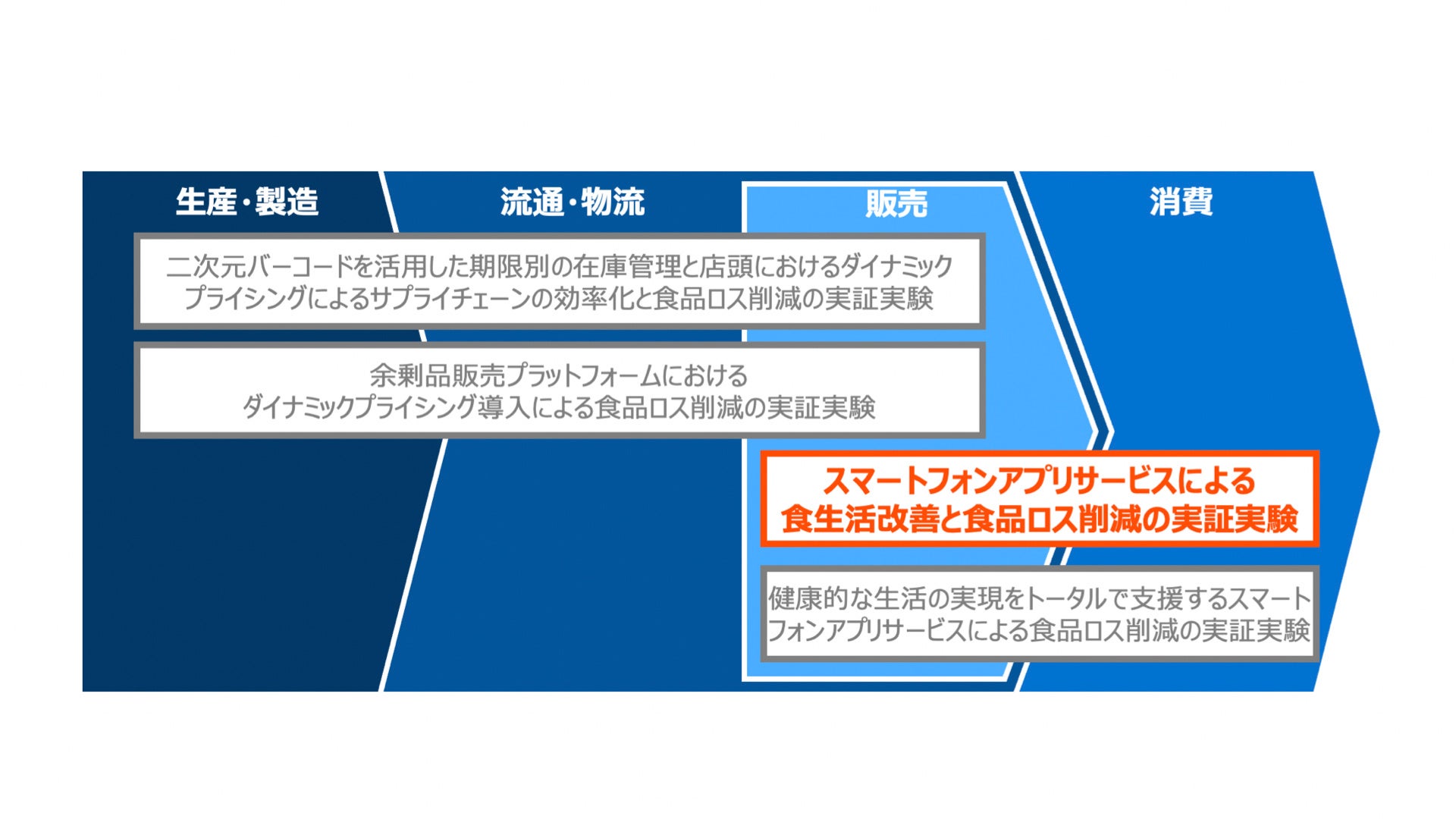 その一つである本実証実験は、消費者行動の変容による食品ロスの削減を目的に、販売から消費までを主な対象として実施します。