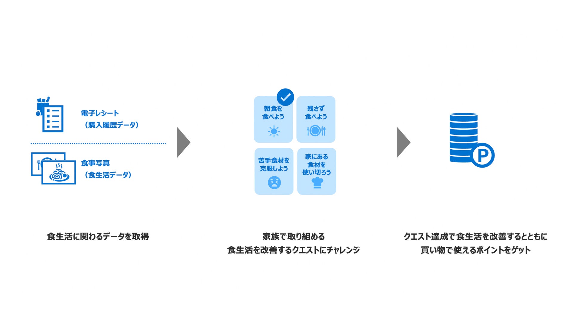 朝食の摂取や苦手食材の克服など、食生活の改善を促すクエストの提供を通じ、食生活の改善効果を検証します。また、家族で取り組むことによるシナジー効果の有無も検証します。