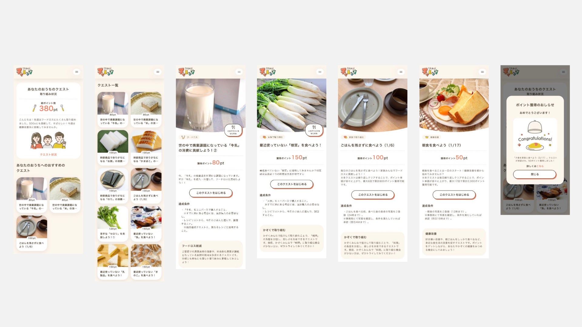 朝食の摂取や苦手食材の克服など、食生活の改善を促すクエストの提供を通じ、食生活の改善効果を検証します。また、家族で取り組むことによるシナジー効果の有無も検証します。