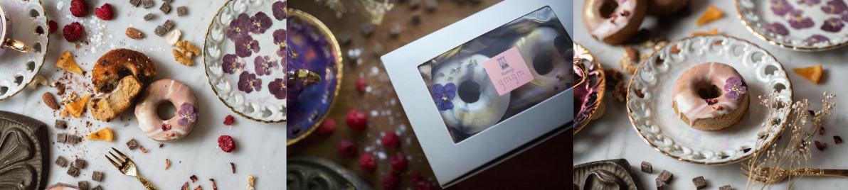 大理石の模様のミルクチョコレートにエディブルフラワーをデコレーションした焼きドーナツ。フランボワーズ×ショコラとアーモンド×オランジェットの2つの味をお楽しみいただけます。