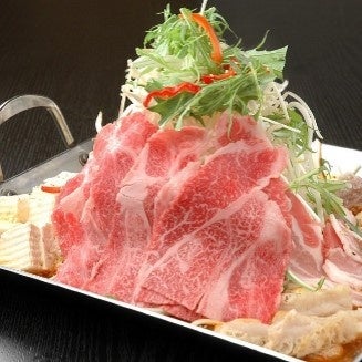 特注したフチのある鍋に細もやし、煮キャベツを盛り、その上にしゃぶしゃぶより厚めの牛肉、豚肉を盛り付けています。自家製ポン酢ダレと焼肉タレに酸味を足したさっぱりダレにくぐらせてお召し上がりいただきます。食材は主に和牛と霧島山麓SPF豚を使用していますが、鍋で提供できない部分は焼肉、単品料理などに使用し、食材のロスが出ないようにアレンジしています。