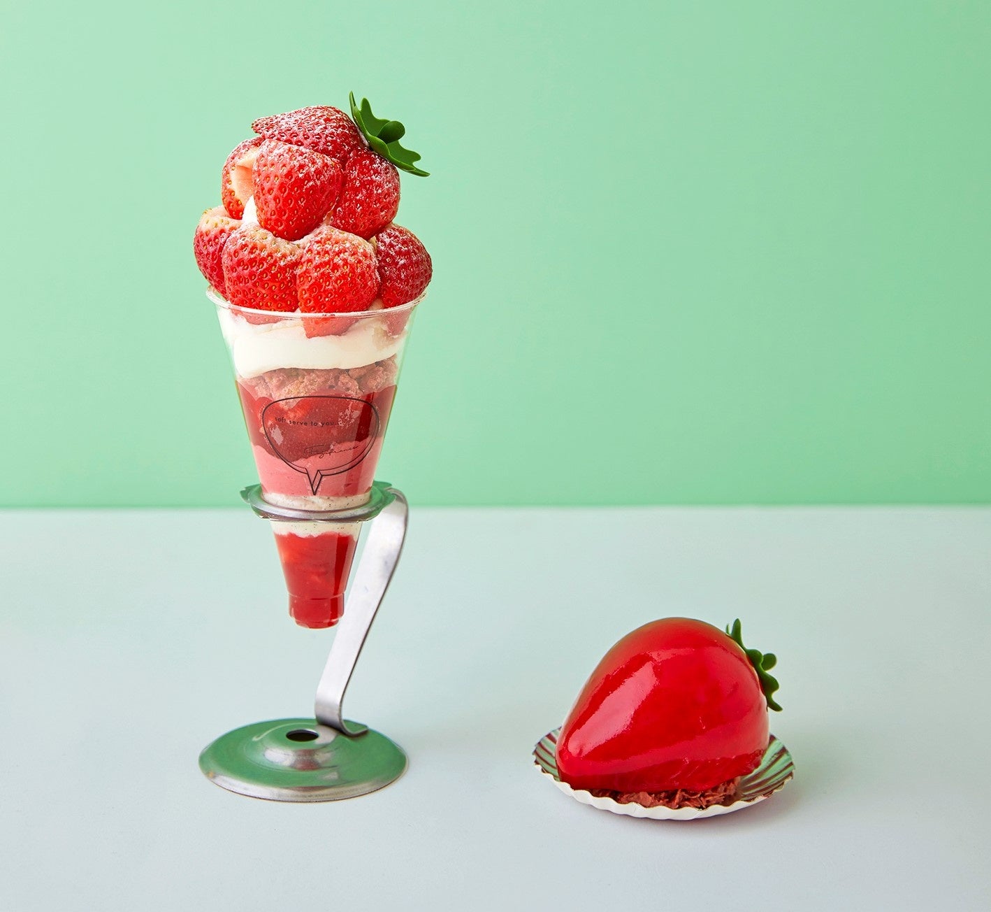 山盛りの国産いちごの中にはいちごメレンゲとなめらかソフト、いちごチョコで包んだ塩クッキーに、いちごとバナナのミルクソースなど食感も味わいもいろいろ! パフェは白いちごの“淡雪”バージョンも。いちごケーキは、ライチ香るバナナジャムやいちごソース入り!チョコでできたヘタで最後まで楽しめるのもうれしい!