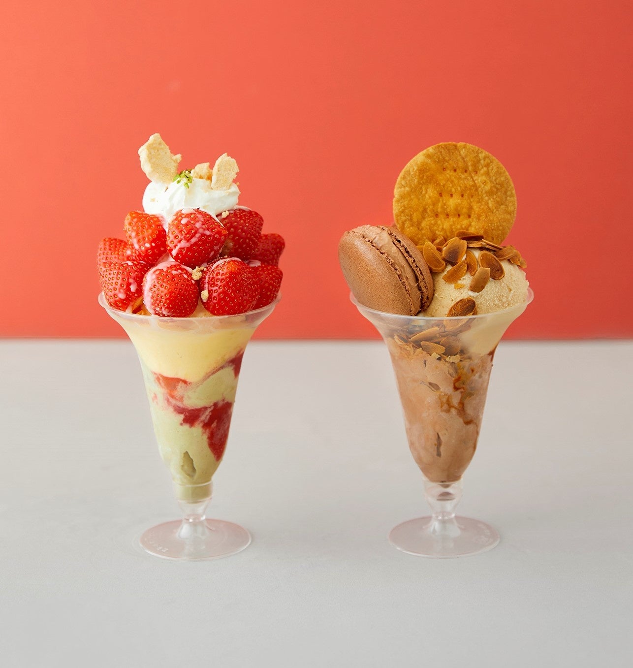 パリや日本で腕を磨いたオーナーが作るパフェは、繊細でやさしい甘さが魅力。自慢のアイスを上下に盛り込み、左のパフェではいちごと一緒にコクのあるミルクとピスタチオのアイスが、右のパフェでは濃厚なチョコとアーモンドのアイス、アイスをサンドしたビッグサイズのマカロンも味わえます。