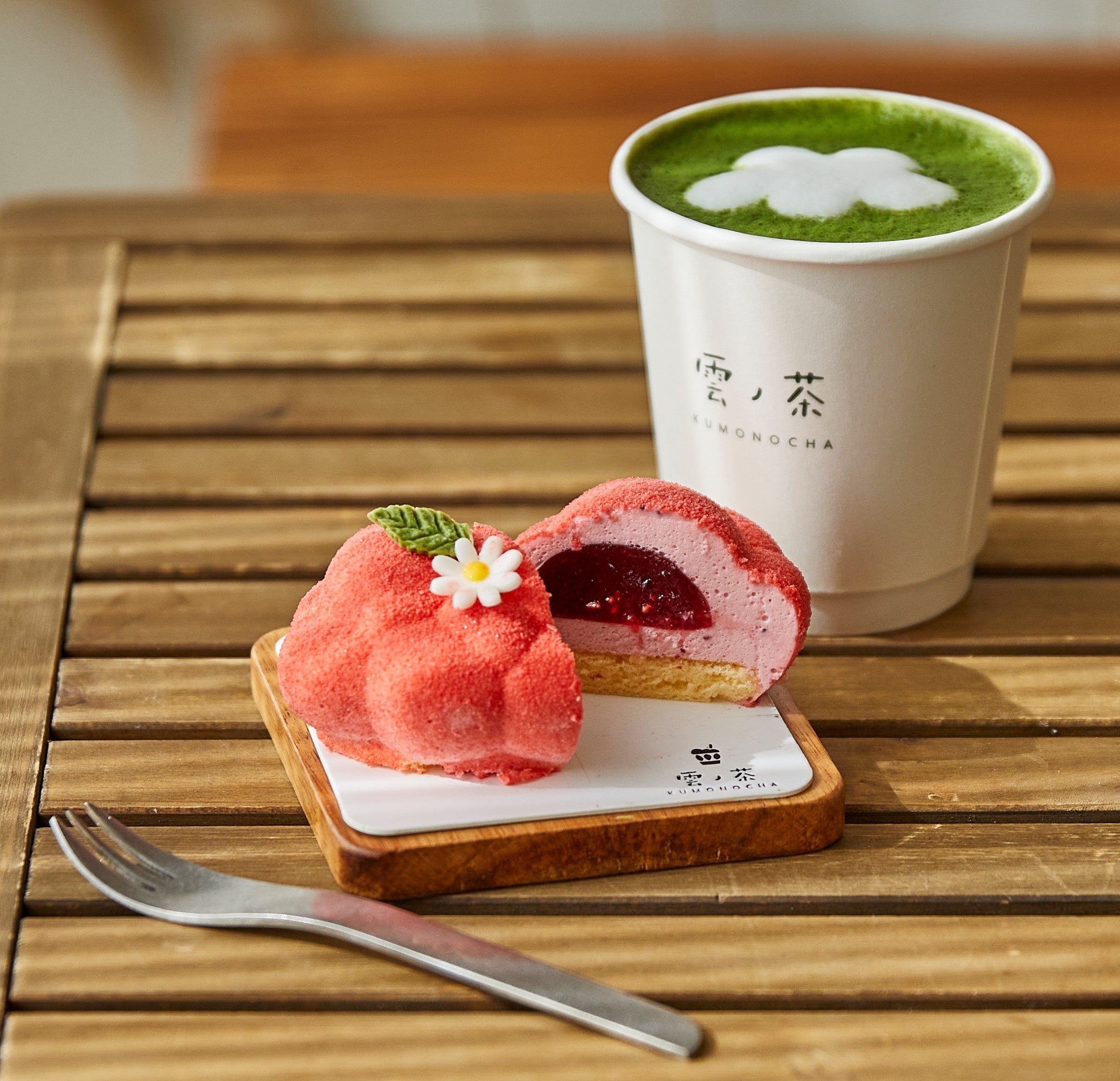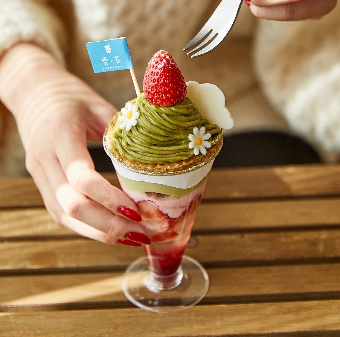 宇治抹茶モンブランのパフェは、いちごのピューレとゼリー、いちごヨーグルトでさっぱりと。いちごクリームを挟んだワッフルも忍ばせて。もこもこな “雲ノ苺ムース” は、いちごムースにいちご&ラズベリーのピューレをIN!“雲ノ苺ムース”は練乳と生クリームを加えたミルクたっぷりの宇治抹茶ラテとのセットも。