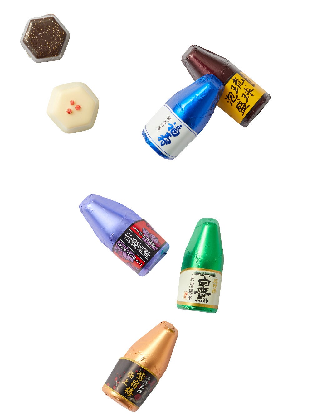 日本酒や焼酎、泡盛など人気の和酒がボトル型のチョコからとろり。ガナッシュにも和酒をたっぷり練り込んで。