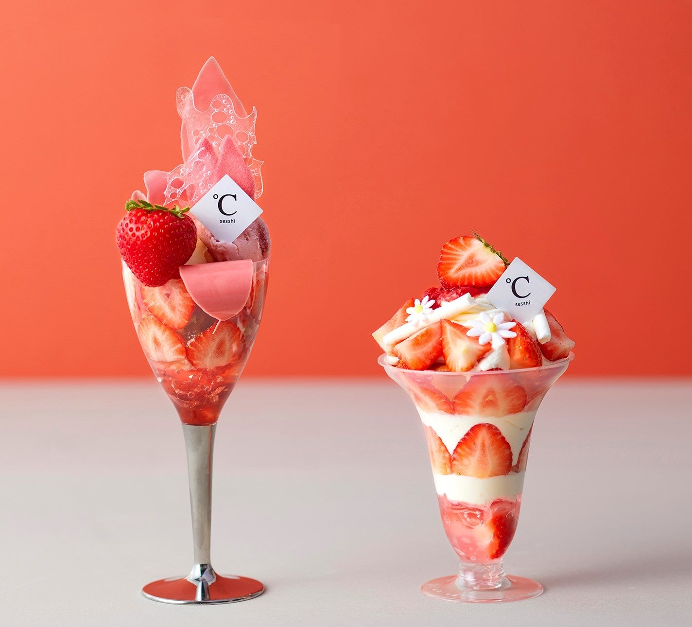 左のパフェは佐賀県産のいちご“いちごさん”を中にも上にもたっぷり!甘さ控えめの生クリームやムチッと弾力のある新食感ゼリーがいちごのおいしさをより一層引き立てます。右のパフェは“いちごさん”に加え、2つの白いちごも楽しめる贅沢パフェです。