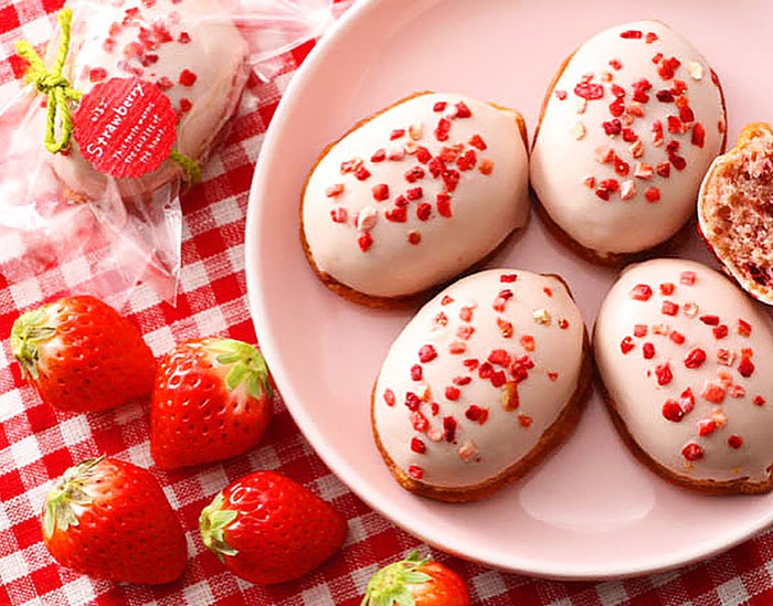 パフェには、お店で人気の“いちごタルト”をまるごとのせて。北海道産クリームチーズのムースの下には、赤ワインでコクをプラスしたラズベリー、クランベリー、いちごのベリームース。最後に、流れるホワイトソースで仕上げます。他にも、阪神梅田本店限定のベリームースを入れてかわいくチョコがけされたいちごドーナツや、 1日800個売れた、外はさくっと中はもちっと、牛乳を使わず軽やか食感のドーナツも必見!