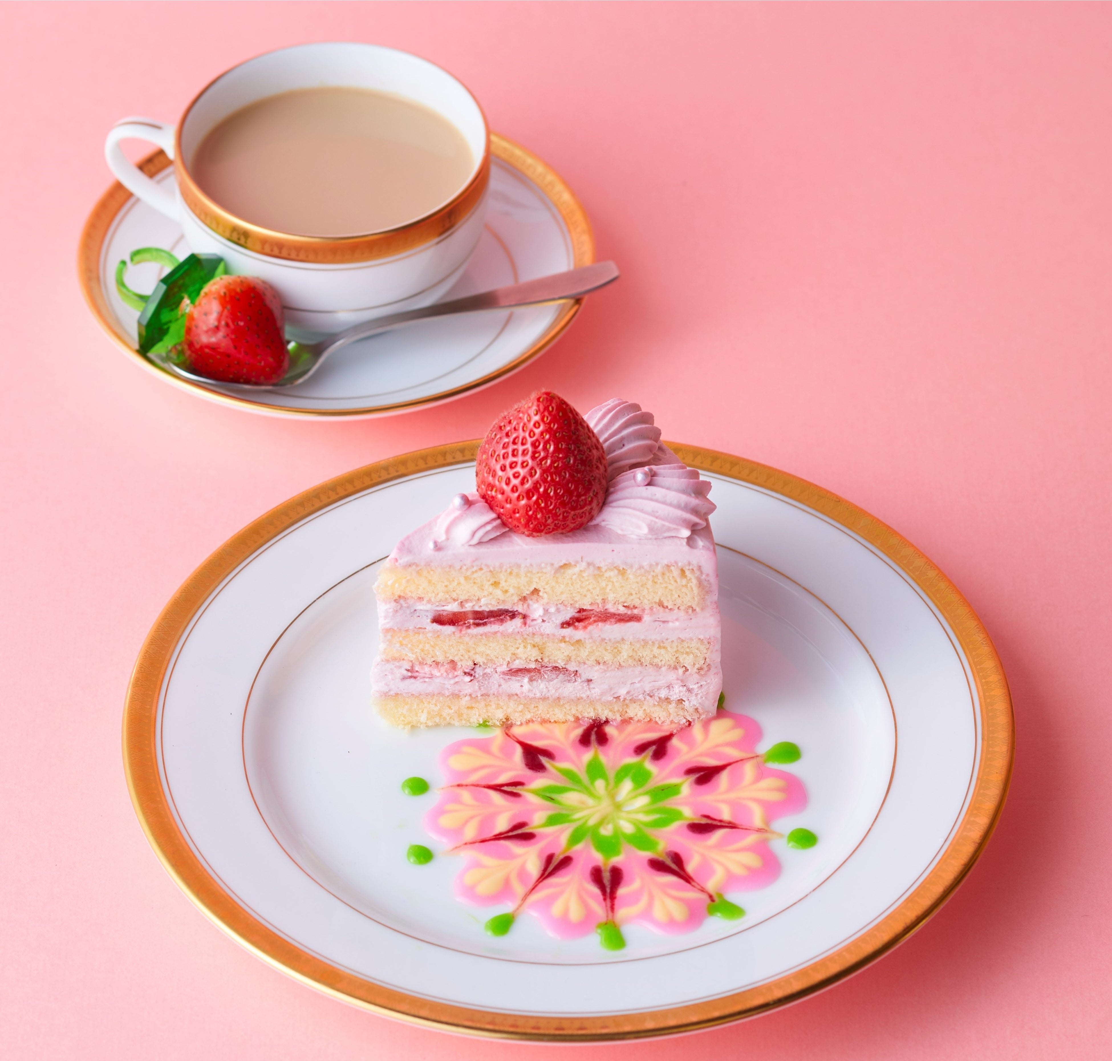 お皿に描いたお店名物のソースアートは、いろんな柄もお楽しみに。いちごが香る「ロンネフェルト」社のロイヤルミルクティーとのセットも。