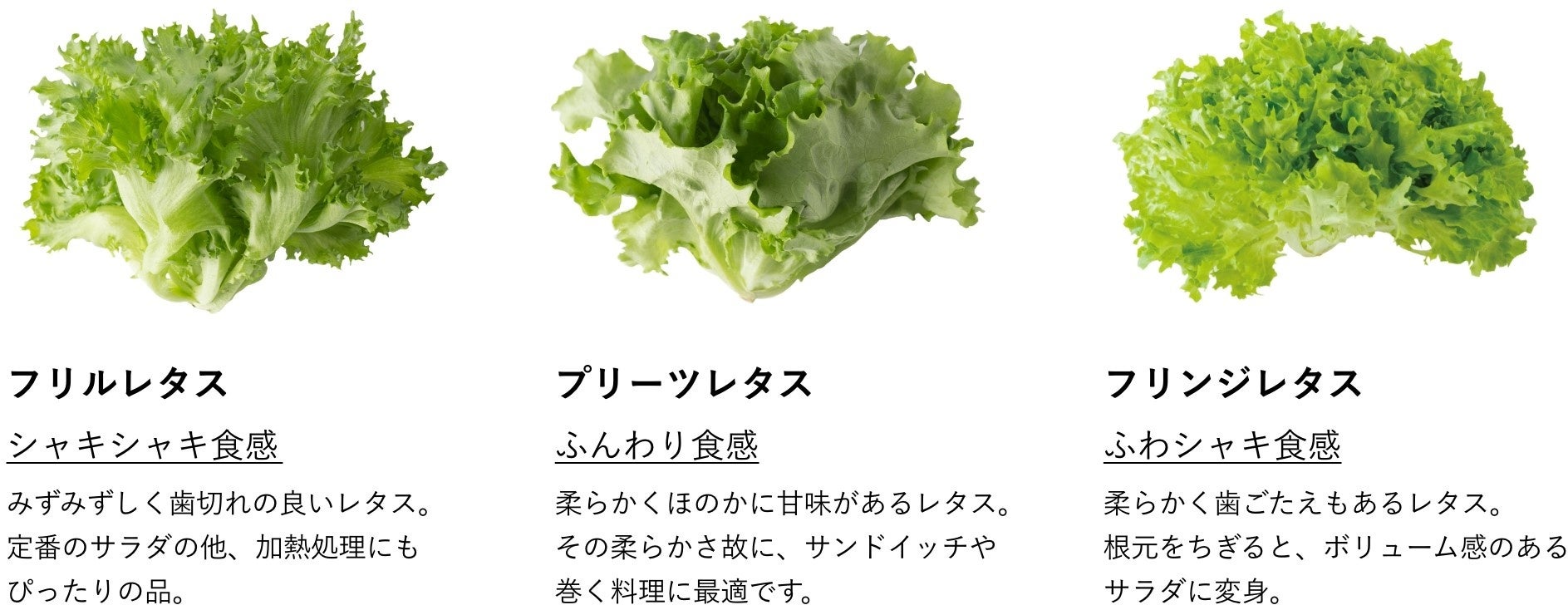 複数の特許を取得した独自の水耕栽培方法を用いて、野菜の美味しさ・食感を追究。密閉した空間のため虫や雑草の心配がなく、農薬を使用せずに栽培し、レタスにとって快適な環境を作ることで苦みやえぐみが少なくレタス本来の味が楽しめる商品を作っています。また、全品種において、β-カロテンの含有量が緑黄色野菜の基準を満たしており、一般的な玉レタスと比べて5倍以上となっています。