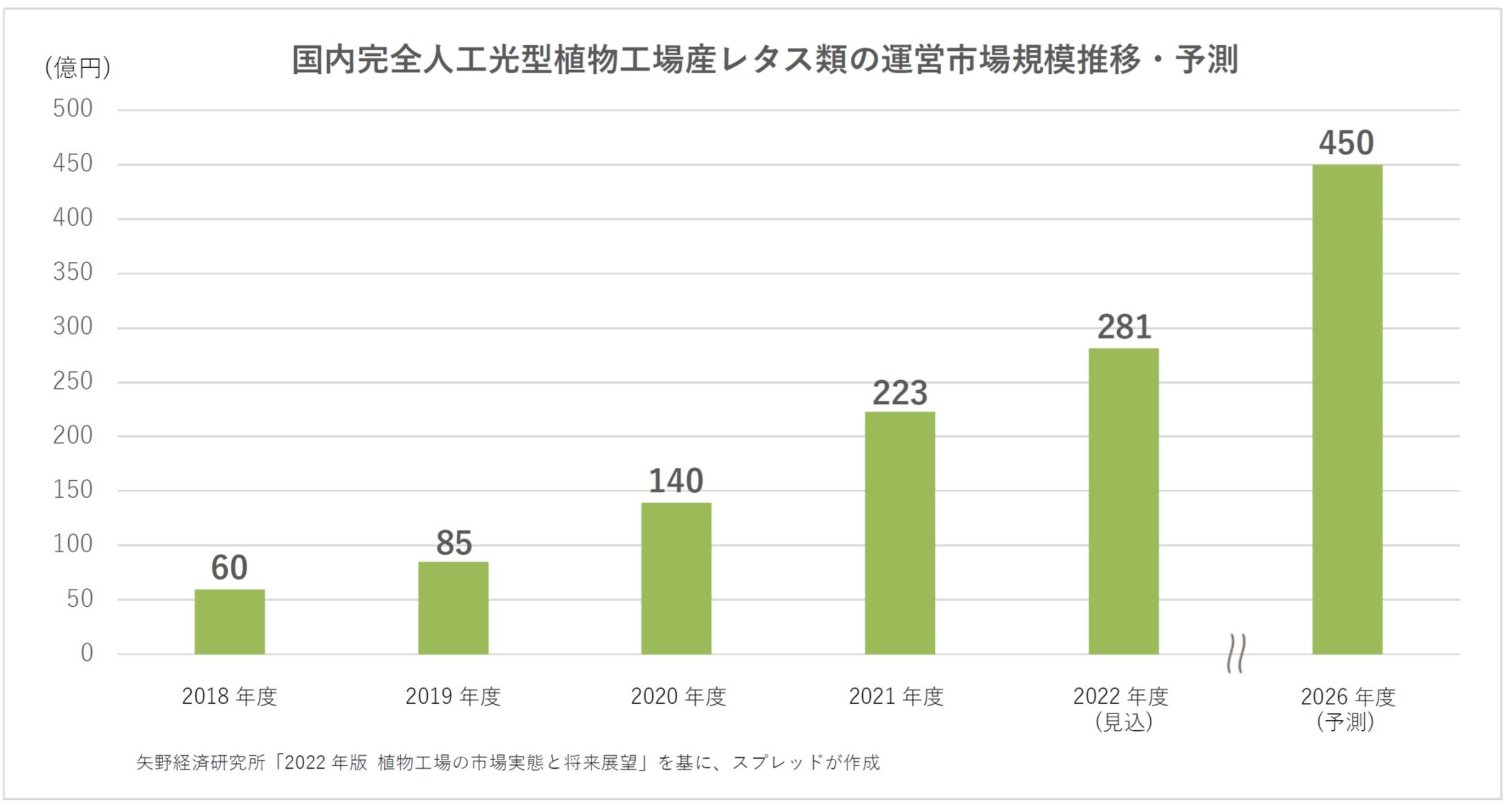 今では多くのスーパーマーケットで売場に並ぶ植物工場産レタスですが、その市場規模は2022年に約280億円、2026年までには450億円になると予測されており、市場拡大が見込まれています※3。