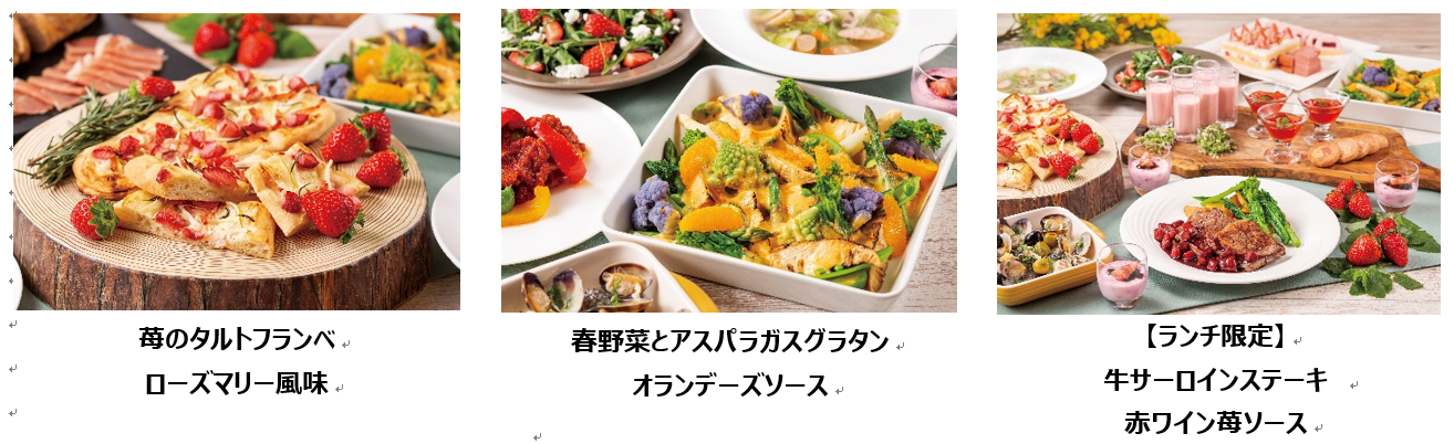 苺のタルトフランベ ローズマリー風味、春野菜とアスパラガスグラタン オランデーズソース、千葉県産スズキとアサリのマリニエール レモン風味、オムライスコーナー、苺と水菜のサラダ カッテージチーズ、苺のババロア、苺とヨーグルトのスムージー エルダーフラワーの香り、苺のショートケーキ、苺のバームクーヘン、苺のレアチーズケーキなど 40種類以上