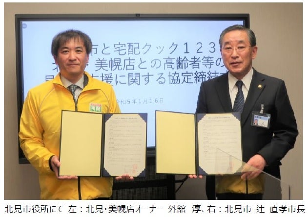 株式会社シニアライフクリエイト(本社:東京都港区、代表取締役:高橋洋)が展開する高齢者専門宅配弁当サービス『宅配クック ワン・ツゥ・スリー』の加盟店である「宅配クック ワン・ツゥ・スリー北見・美幌店(運営法人:株式会社エーアンドエー、北海道美幌町)」は、2023年1月16日(月)に北海道北見市と「北見市における高齢者等の見守り支援に関する協定」を締結しました。『宅配クック ワン・ツゥ・スリー』店舗が全国の自治体と見守り等に関する協定を締結するのは、今回で71件目となります。