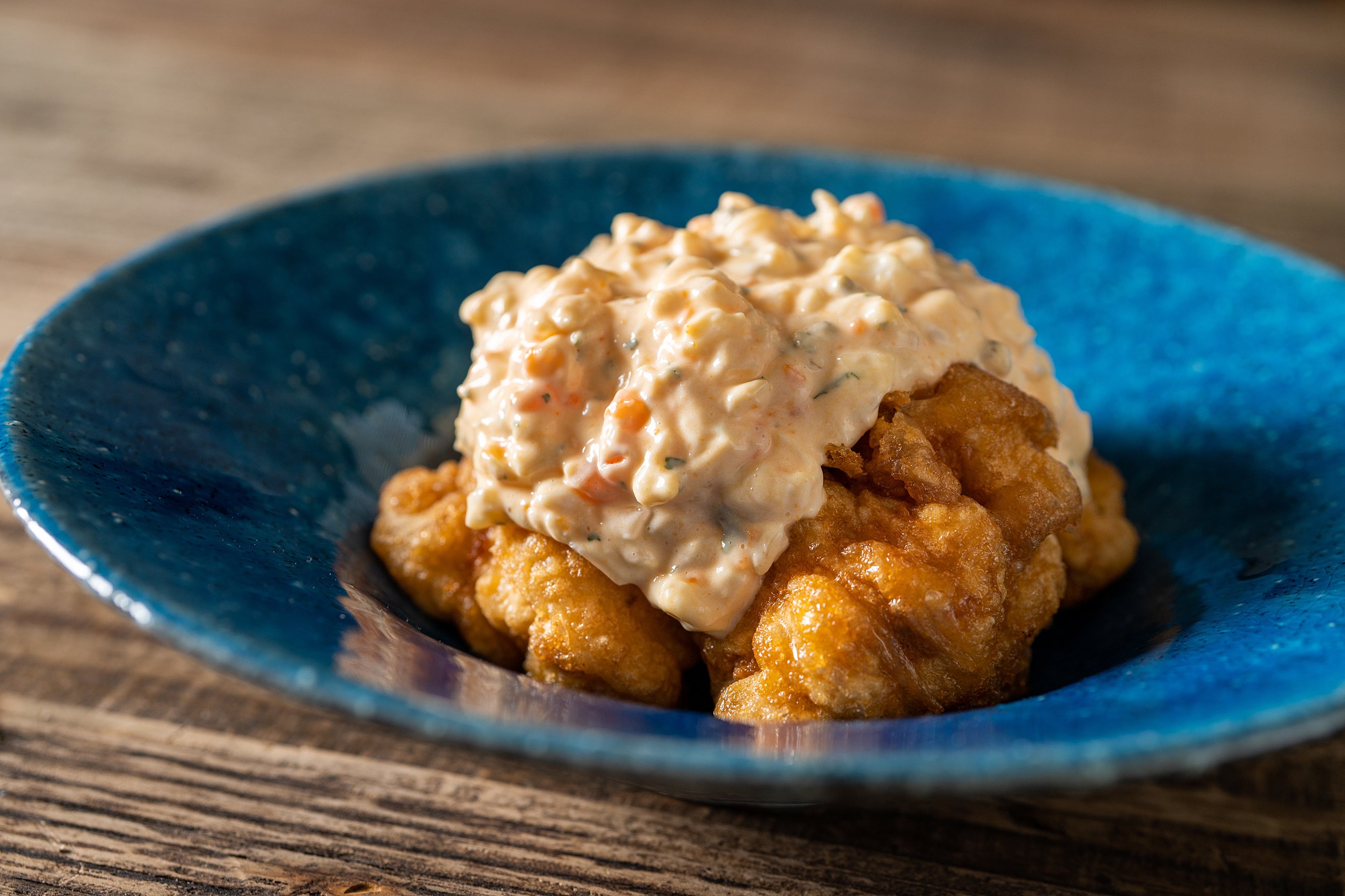 本場宮崎のチキン南蛮はモモ肉を一枚丸ごと唐揚にし、ザクザクとカットして提供するのが主流ですが、塚田農場ではみんなでシェアできるようコロコロのひと口サイズにこだわります。衣はこれまでに変わらず、甘酢をよく吸うように玉子を絡めて揚げるふんわりタイプ。甘酢と肉汁がお口の中でじゅわっと混ざりつつ唐揚とタルタルソースが絡みあう、このバランスがさらにアップするよう、改めて全体を見直し、組み立て直しました。