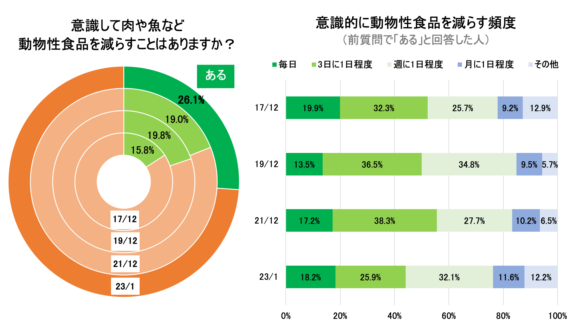 ベジタリアン4.5%とヴィーガン2.4%の合計6.9%から、両方に重複回答した割合1.0%を差し引き、23年1月時点の日本のベジタリアン率は5.9%となりました。