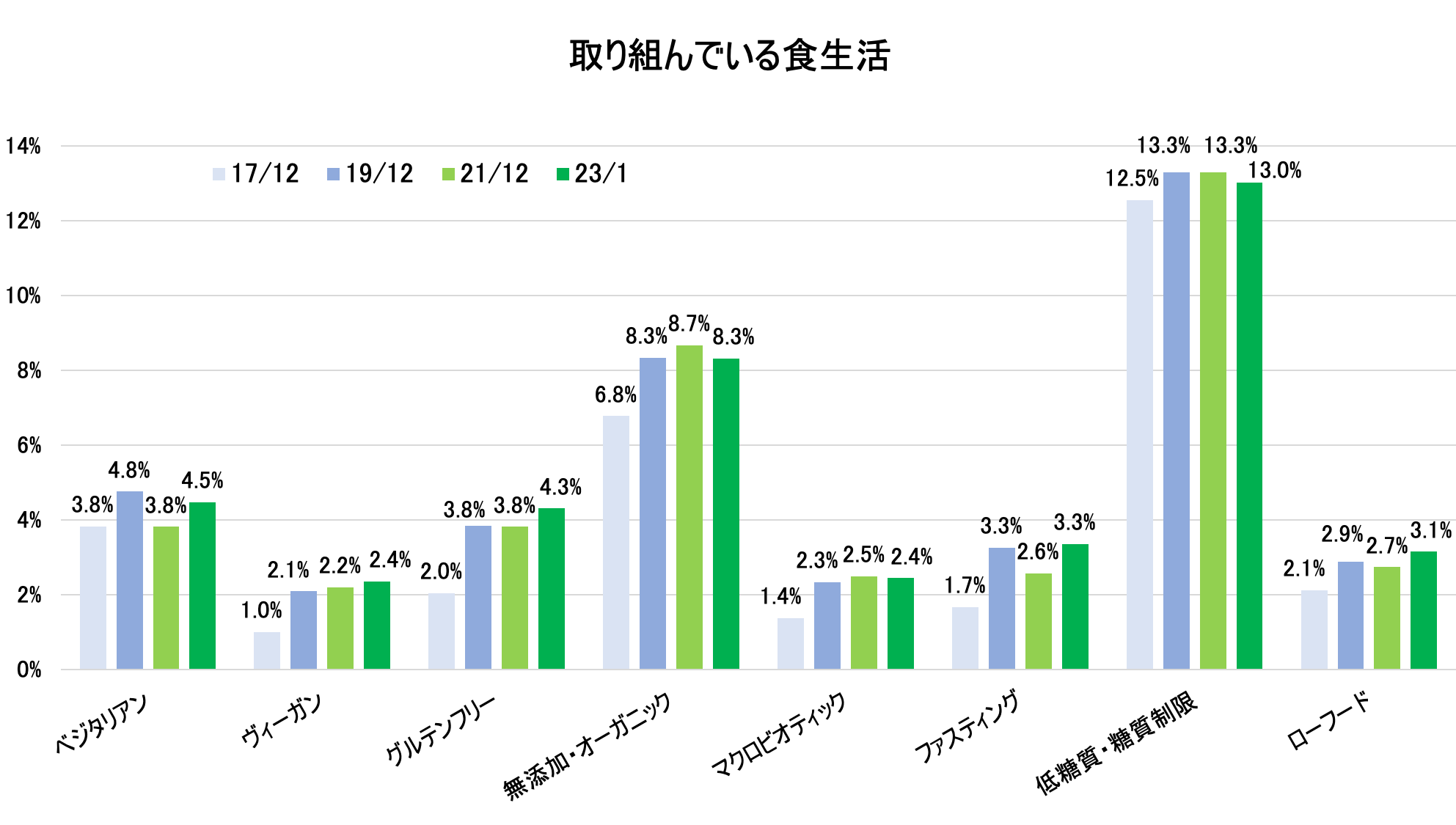 「ご自身が取り組んでいる食生活はありますか?」との質問に対し、今回23年1月の調査ではベジタリアンが4.5%、ヴィーガンが2.4%、グルテンフリーが4.3%、無添加・オーガニックが8.3%、マクロビオティックが2.4%、ファスティングが3.3%、低糖質・糖質制限が13.0%、ローフードが3.1%となりました(複数回答可)。