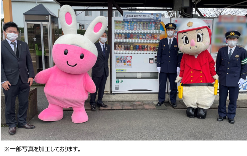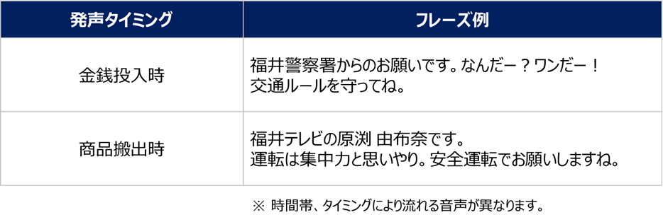 本自販機は、交通安全、特殊詐欺防止を啓発することを目的に企画されたもので、金銭投入時・商品搬出時には福井テレビ 原渕 由布奈(はらぶち ゆうな)アナウンサーの声で「運転は集中力と思いやり。安全運転でお願いしますね。」など、交通安全、特殊詐欺防止についてのオリジナルメッセージが流れる機能を搭載しており、訪れる方々の交通安全などに対する意識向上に繋がるものと期待しております。