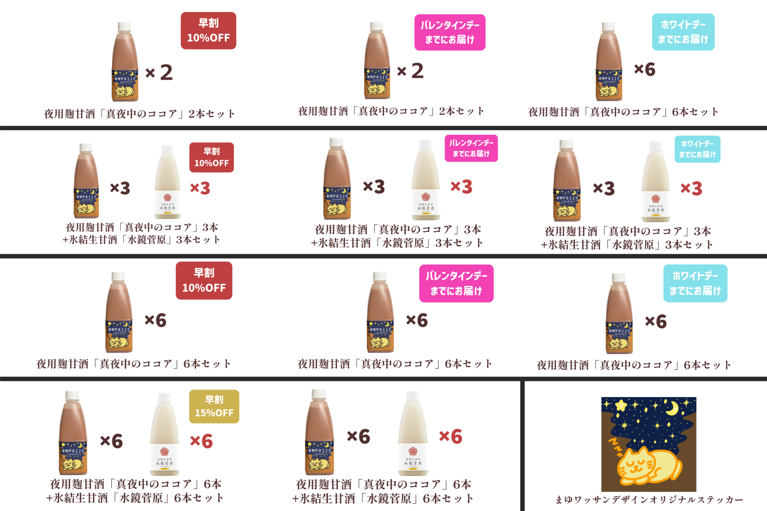 夜用麹甘酒「真夜中のココア」6本と氷結生甘酒「水鏡菅原」6本の計12本のセットです。