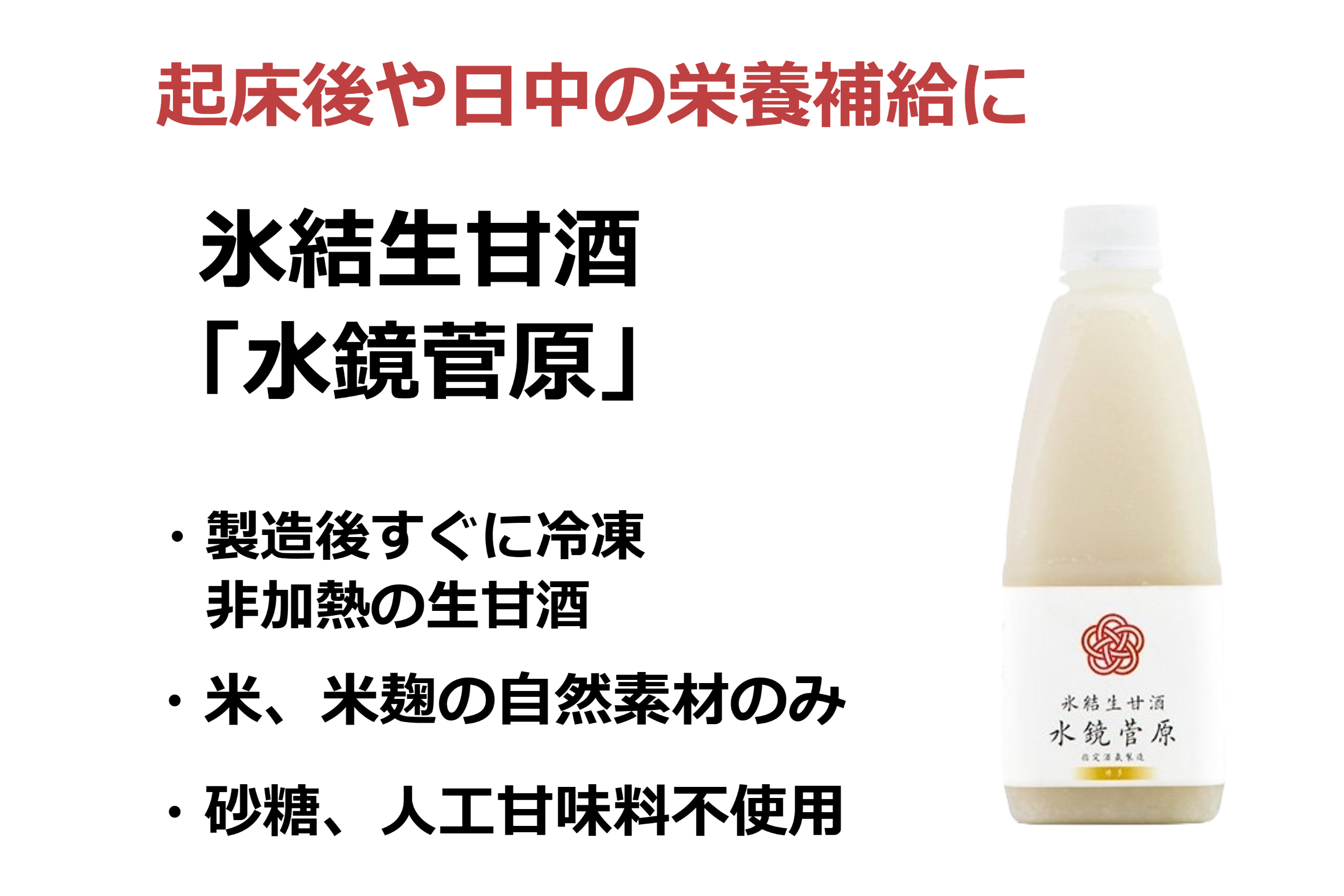 そうして丁寧に造られた氷結生甘酒「水鏡菅原」は、自然なままの美味しさ、麹の力を100%お飲みいただくために、一般に流通している甘酒と異なり高温での殺菌はせず、出来立てを凍結させた生の状態でお手元までお届けしています。保存料なども一切使用していません。