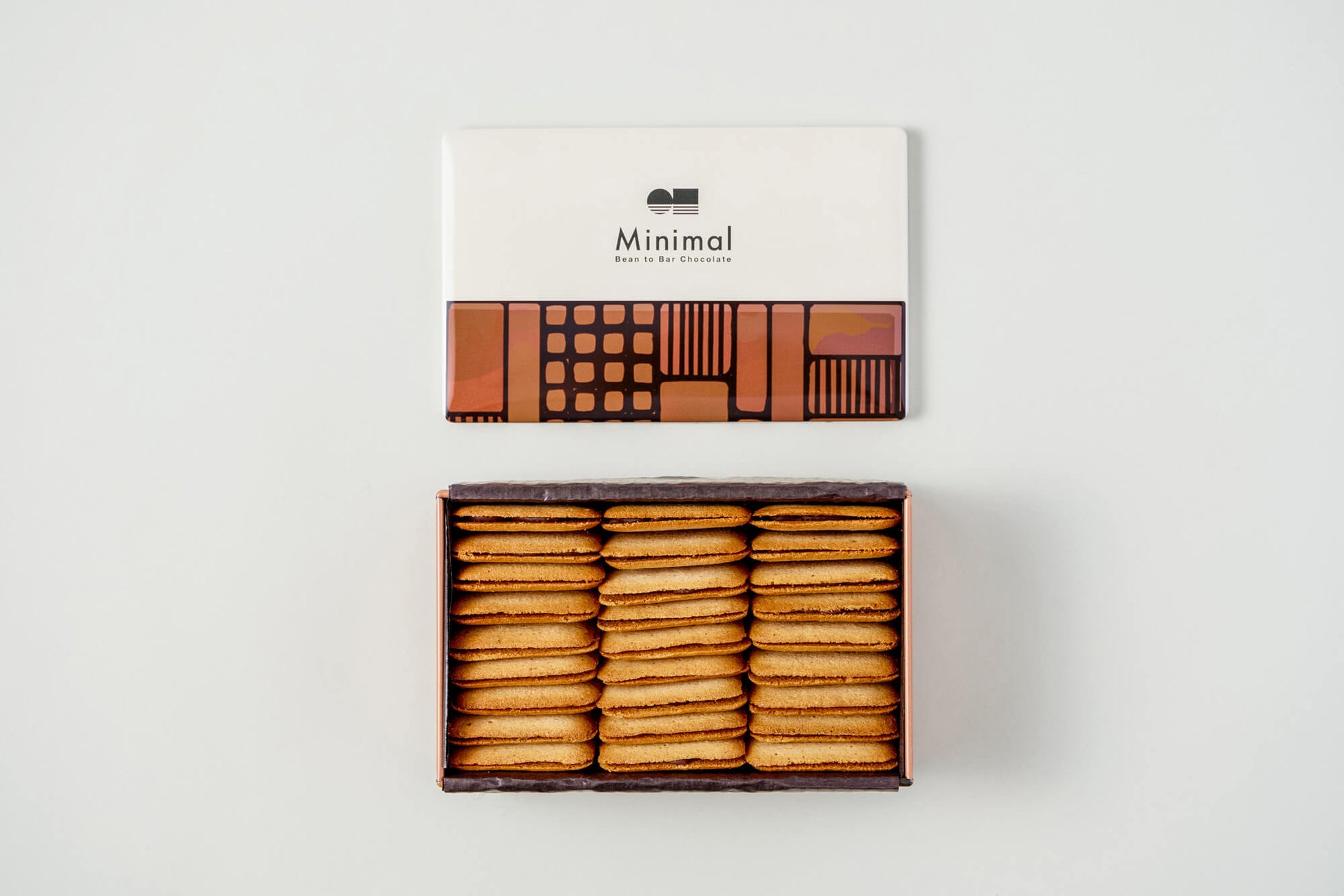 シングルオリジンのガーナ産カカオ豆のチョコレートを使ったラングドシャがぎっしり27枚詰まった、Minimal初のクッキー缶。ラングドシャとチョコレートの相性を考え抜き、オリジナルチョコレートをカカオ豆から仕上げました。