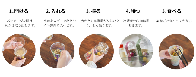 ・ぬか漬けには興味がありましたが、仕事が忙しくなかなか管理する自信がなくて始められずにいました。こちらのキットは量も一人暮らしに丁度良いし、なにより管理がいらないのでとても手軽にぬか漬けを楽しむことができました。日々野菜不足も感じいていたので、ミニ野菜で野菜もとれるのがなお嬉しいです!(20代女性)