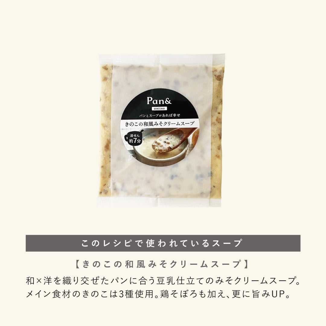 「きのこの和風みそクリームスープ」にネギの薄切り、すりおろし生姜、オリーブオイルを混ぜたものをちょい足し。調理方法が電子レンジという作りやすさと冷蔵庫の中に常にありそうな食材をチョイスしている点が良かったです。加熱したネギの甘味と食感がよいアクセントになり、ネギが苦手なPan&スタッフにも好評でした。