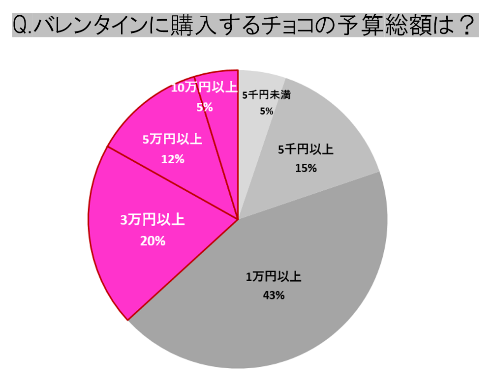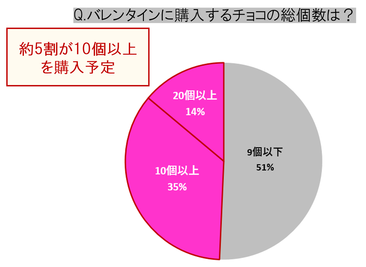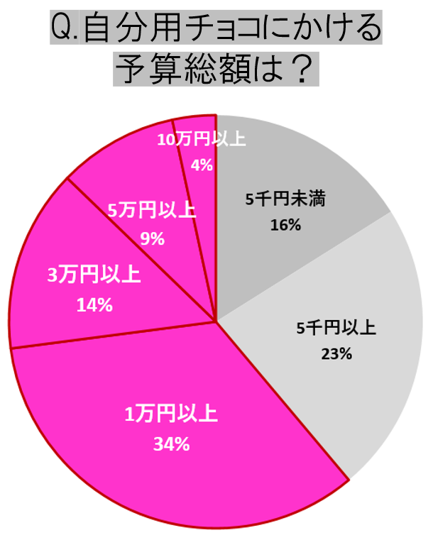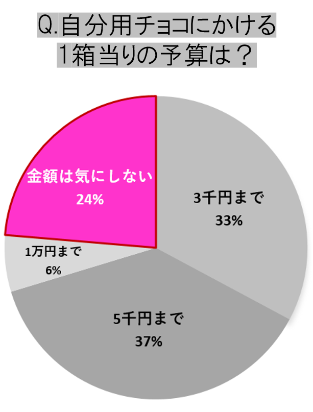 →予算総額「1万円以上」、1箱当りの予算「5千円まで」が最多回答となり、複数購入する方が多数であるとわかりました。また、全体の4分の1の割合が「予算を気にせず欲しいチョコは買う!」という結果から「自分用チョコ」は、ご褒美&贅沢傾向にあるといえます。