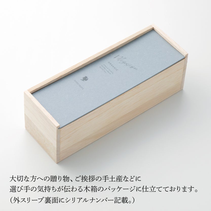 大切な方への贈り物、ご挨拶の手土産などに、選び手の気持ちが伝わる木箱のパッケージに仕立てました。深みのあるブルーの遮光瓶。505本限定。シリアルナンバー入りです。