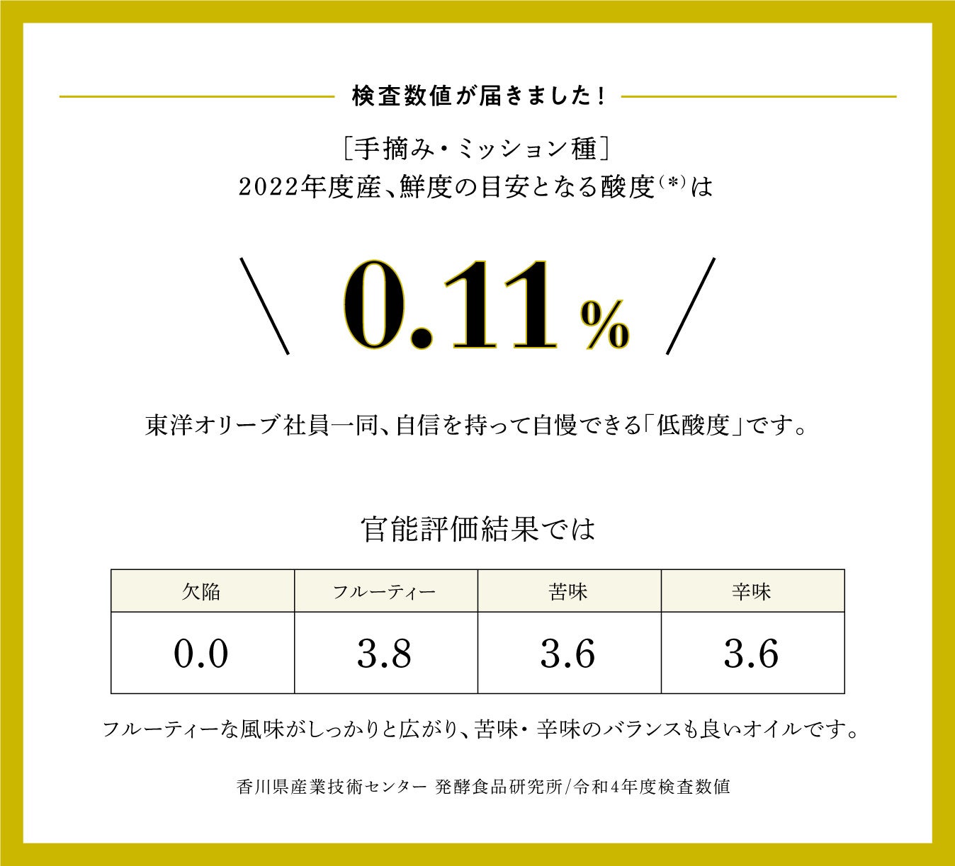 ■ 酸度0.11%。良質のオイル=酸度が低いということ。