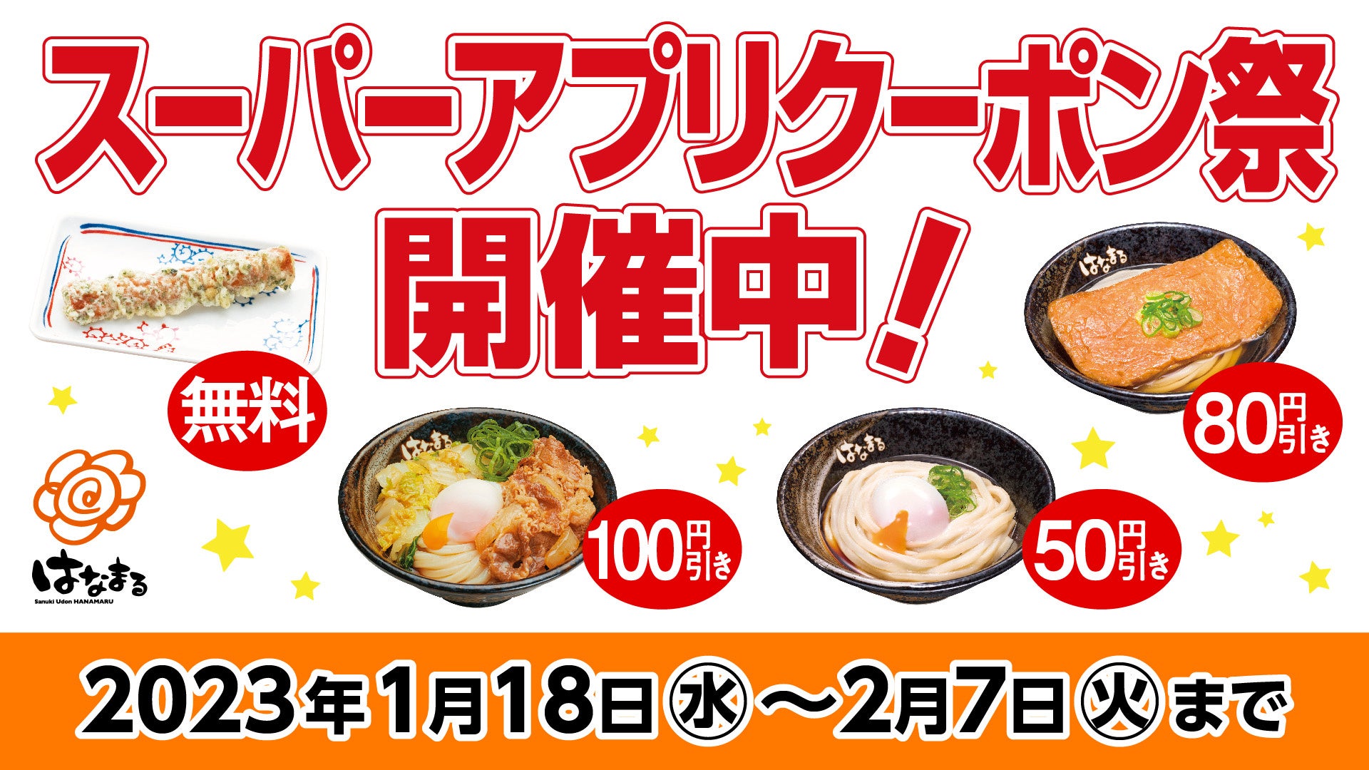 讃岐うどんチェーン「はなまるうどん」を展開する株式会社はなまる(本社:東京都中央区 代表取締役社長:前田良博、以下はなまる)は、2023年1月18日(水)より2月7日(火)、はなまる公式アプリにて牛すきぶっかけ100円引きやちくわ磯辺揚げ無料、お好きなうどん80円引きなど、お得なアプリクーポンを配信いたします。