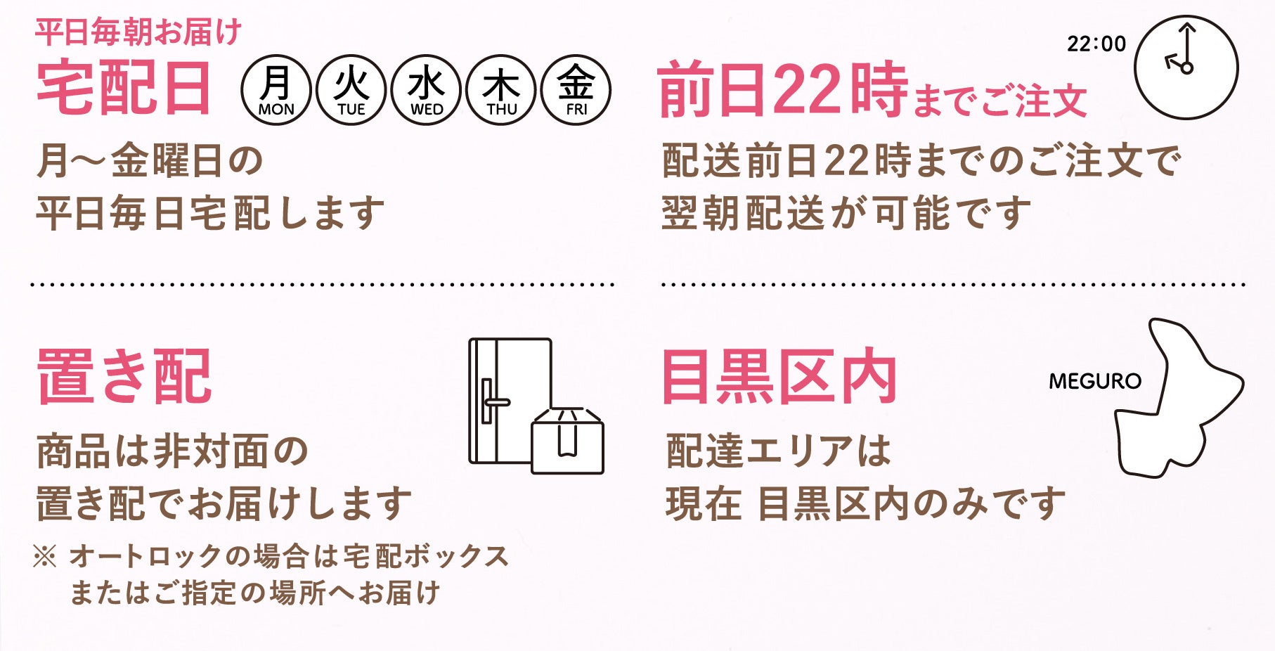 本サービスは、生鮮食品を夜22:00までの注文で翌朝7:00までに玄関先にお届けする、早朝の時間帯を活用した日本初の物流サービスです。完全置き配型の早朝ルート宅配方式※を採用することで、宅配にかかる費用を抑え、忙しい現代社会に合った便利な受け取りを可能にします。