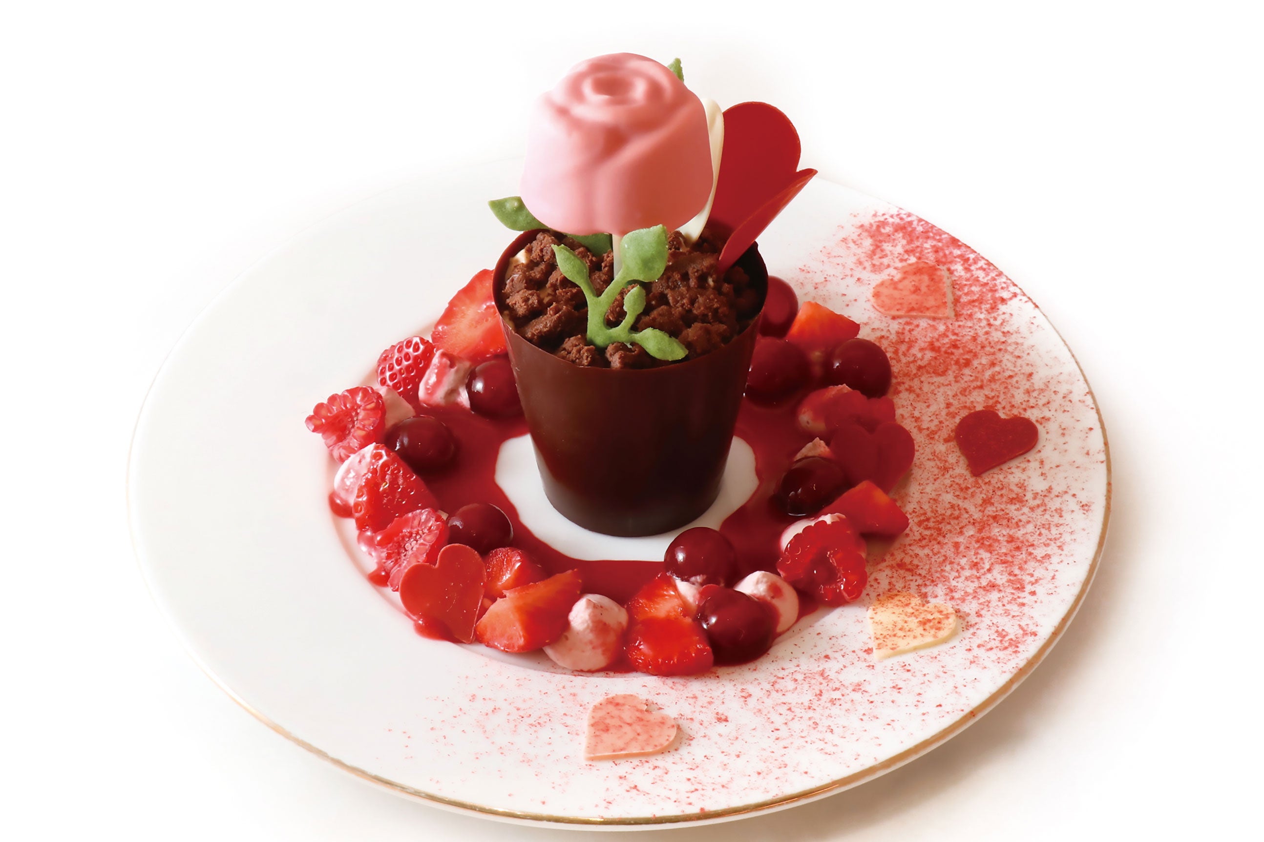 鉢に植えた一輪のバラをイメージしたバレンタイン限定のデセールです。