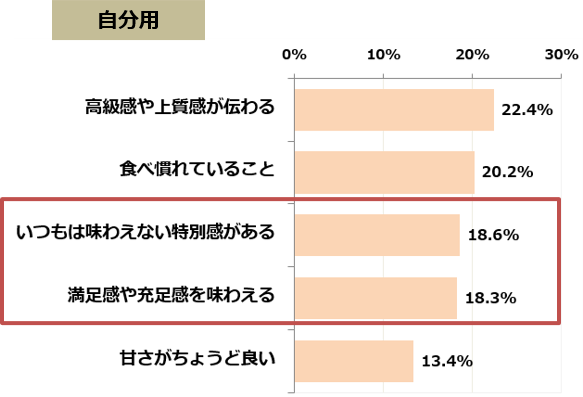 バレンタインのチョコレートを選ぶ際のポイントについては、自分用とプレゼント用どちらも「高級感や上質感が伝わる」(自分用22.4%/プレゼント用25.0%)、「いつもは味わえない特別感がある」 (自分用18.6%/プレゼント用17.0%)が高い回答率となりました。 また、「特別感」や「満足感」は自分用の方が高く、約2割の方が自分用でもいつもとは違う満足感や特別感を味わいたいと思っていることがわかりました。 自分用、プレゼント用問わず、バレンタインデーのチョコレートには、やはり高級感や特別感のあるものを選ぶ傾向にあるようです。