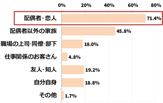 プレゼントを渡す相手についての質問では、「配偶者または恋人」が71.4%、「配偶者以外の家族」が45.8%と、身近な人へのプレゼントが多いという結果になりました。