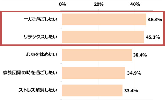 余暇の過ごし方では、「一人で過ごしたい」が46.4%、「リラックスしたい」が45.3%という結果になり、特別な日だからこそ、普段とは違った特別な過ごし方をしたいという人が多いようです。