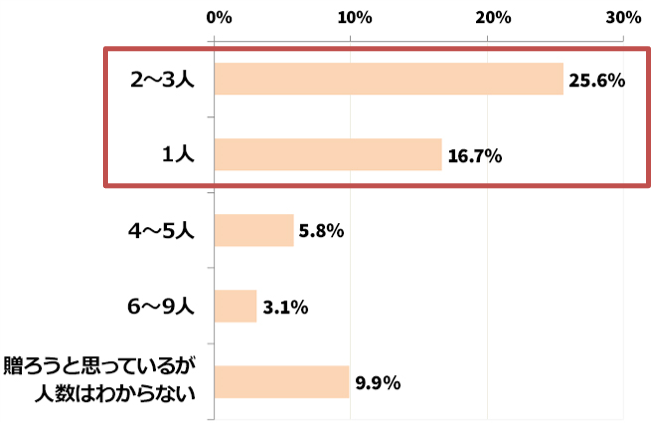 バレンタインデーにプレゼントを渡すかどうかの質問では、全体の6割以上は「誰かに渡す予定がある」という結果になりました。渡す人数については、3人以下の少人数に渡す人が多いようです。バレンタインは特別な人にプレゼントを贈るという傾向が伺えます。