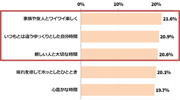 特別な日の過ごし方の理想は、「家族や友達とワイワイ楽しく過ごす、「いつもと違うゆったりとした自分時間」、「親しい人と大切な時間」がそれぞれ約2割。誰かと過ごす、または一人だけどいつもと違う過ごし方の傾向に。