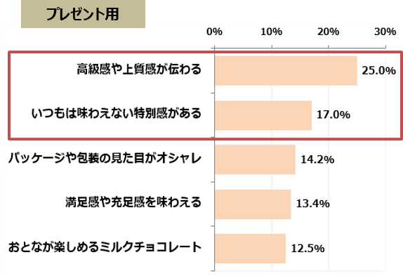 さらに、チョコレートを選ぶ際に重視しているポイントについて、自分用とプレゼント用のどちらも共通して「高級感や上質感が伝わる」(自分用22.4%/プレゼント用25.0%)、「いつもは味わえないと特別感がある」 (自分用18.6%/プレゼント用17.0%)が高い回答率となりました。バレンタインという特別な日だからこそ、日常とは違ったものを選ぶ傾向があるようです。