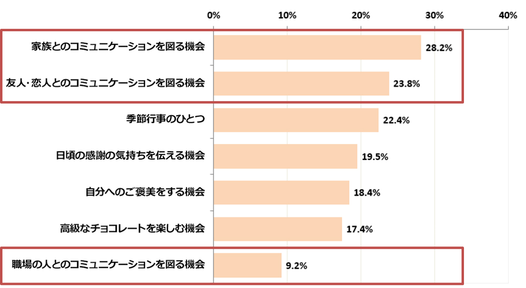 今回のアンケート調査で、約6割の人がバレンタインは誰かとコミュニケーションを図る機会と回答しました。また、「自分へのご褒美」と考えている人は2割でした。