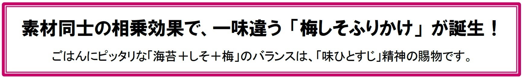 ふりかけは“子どものごはんの友”として親しまれてきましたが、“子どもだけでなく大人も楽しめる、素材の味を活かしたふりかけ”をコンセプトに、1989年10月にメニューと味を追求して開発したのが「おとなのふりかけ」です。「梅しそ」の他に5 品(本かつお、紅鮭、わさび、焼たらこ、海苔たまご)を展開しています。