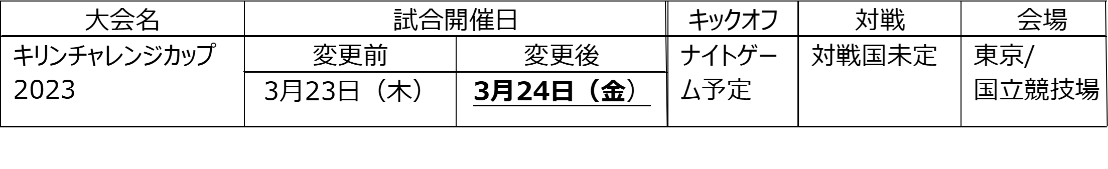 2023年3月23日(木)に開催を予定しておりました「キリンチャレンジカップ2023」(東京/国立競技場)は、参加する選手のコンディションを考慮し、主催者である公益財団法人 日本サッカー協会の判断のもと、開催日の変更が決定しました。