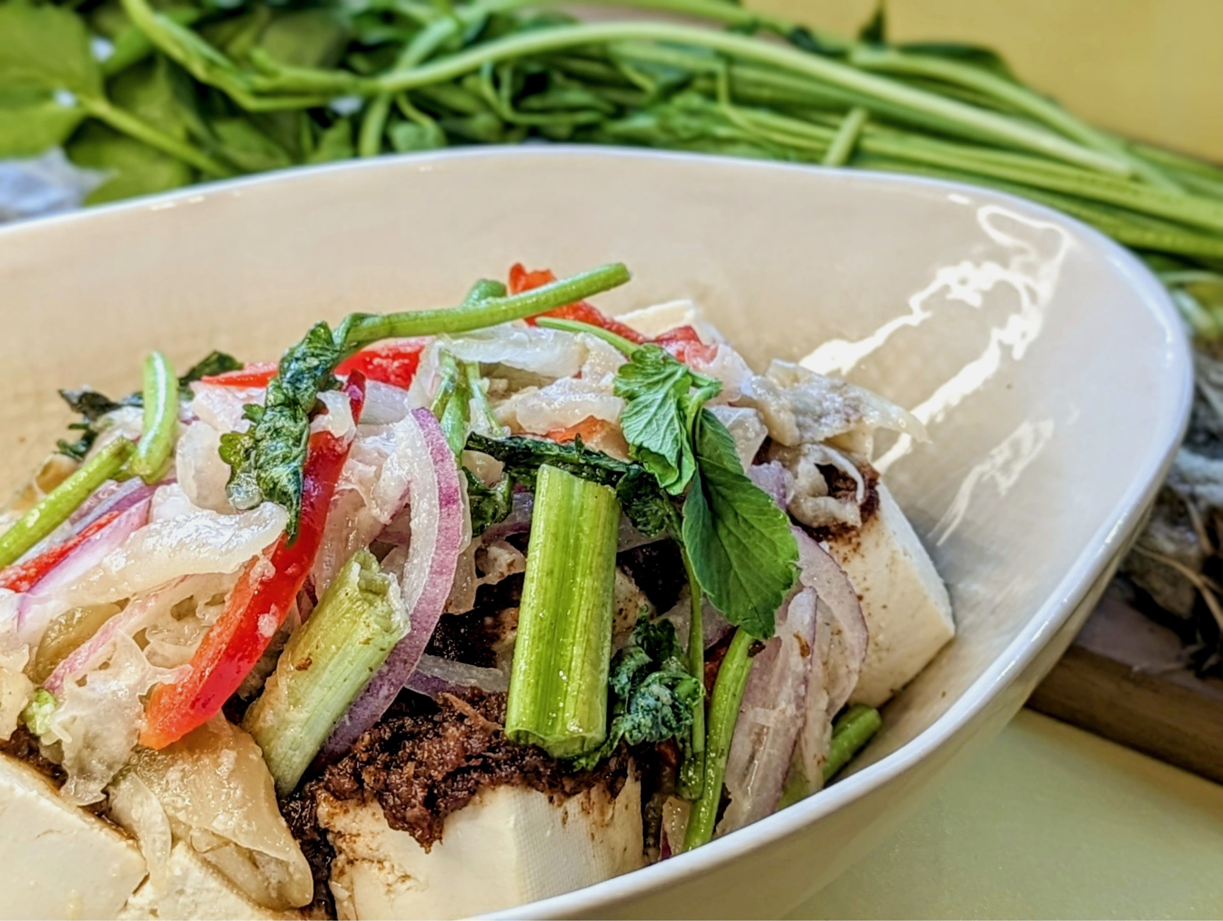 ほろ苦いせりの爽やかな香りとシャキシャキ食感、白キクラゲとザーサイのコリコリ食感が楽しい、野菜と豆富のサラダです。おかかと豆富の和と、中華風のザーサイが新しいハーモニーを奏でます。