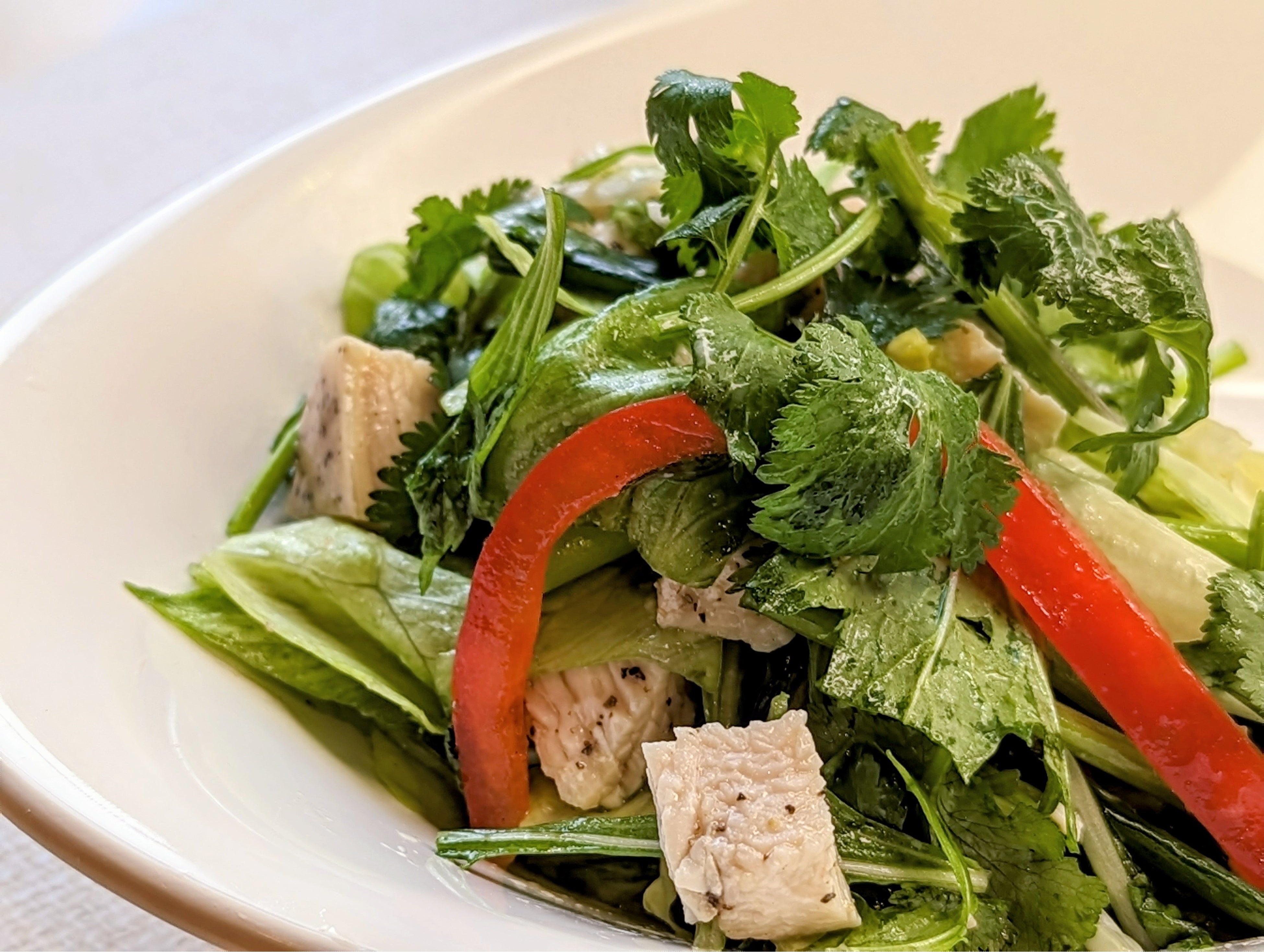 独特な香りと味が特徴のパクチーを、さらに引き立たせる特製オイルソースが絶妙。蒸しチキンやレタス、ミニネギ、赤パプリカを加えた、食べごたえのある、パクチー好きにはたまらない一品です。