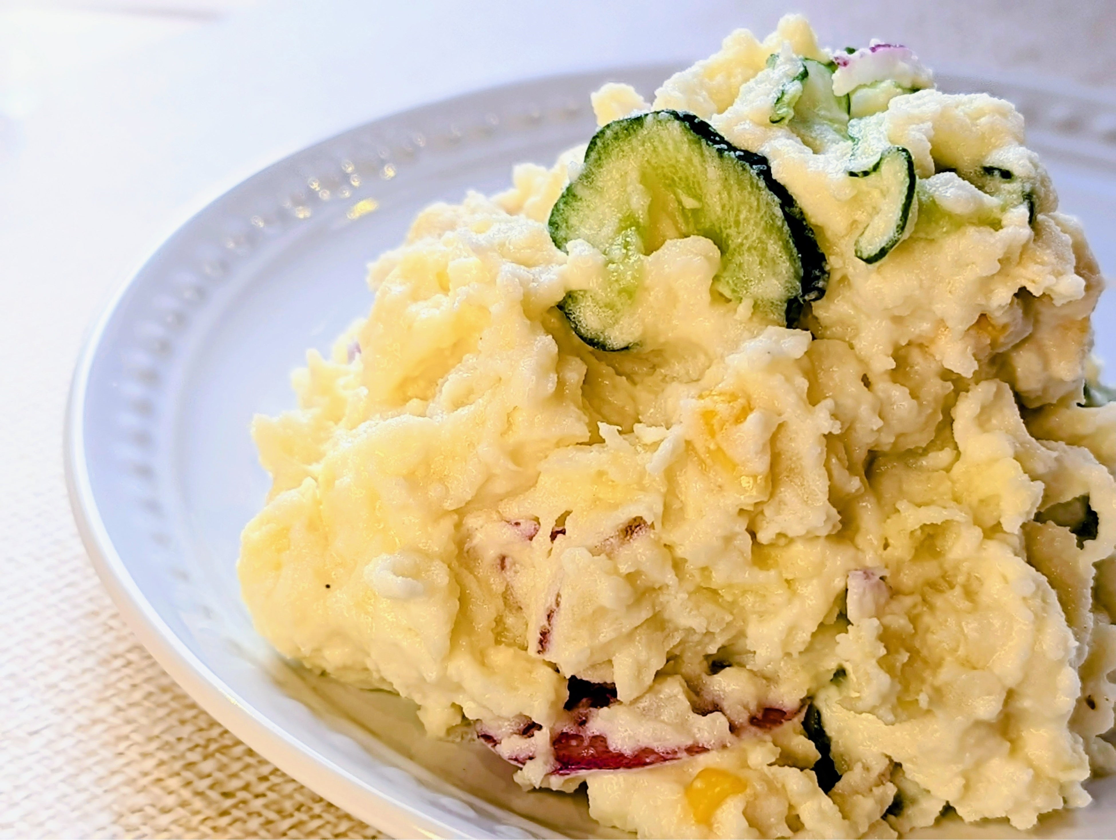 滑らかな舌触りのじゃがいもに、きゅうりやレッドオニオンをアクセントに加えた、手作りのポテトサラダです。明太子ドレッシングをかけたり、チーズで濃厚にしたり、大人味でフライドオニオンをトッピングするなど、アレンジもオススメです。
