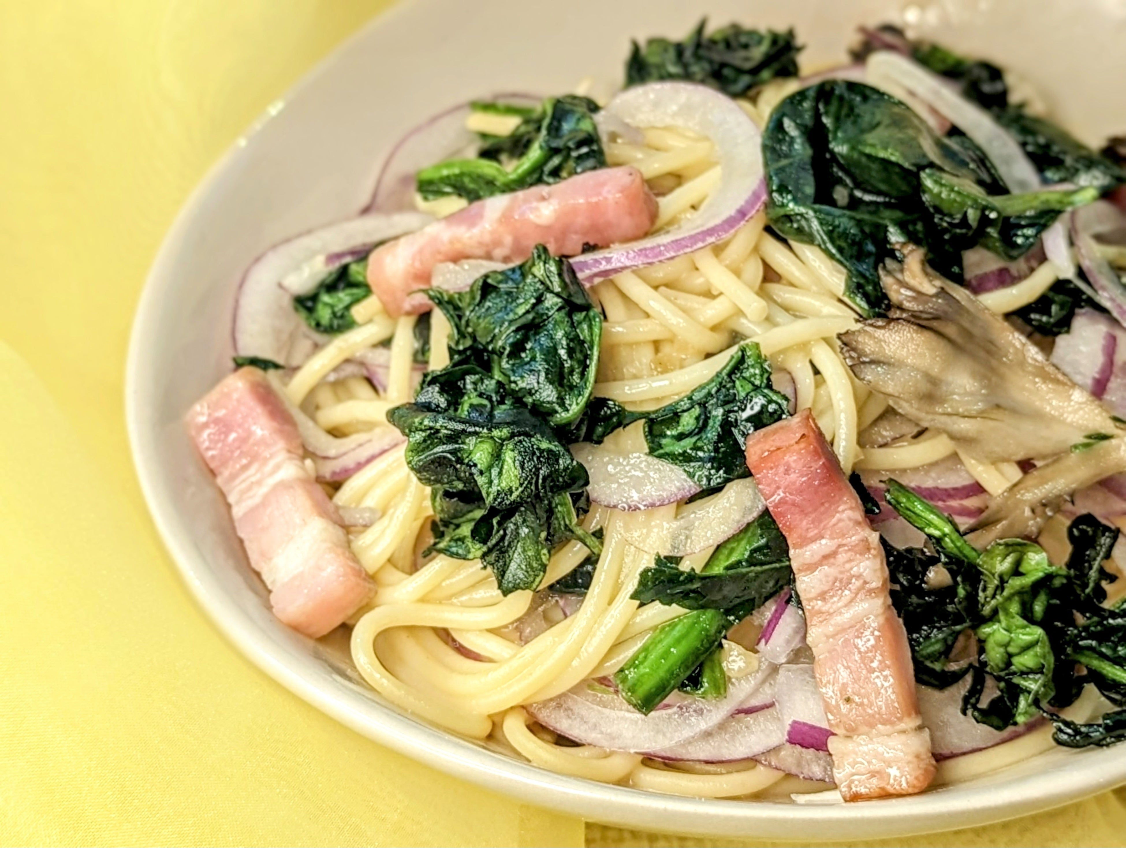 ▲「ちぢみほうれん草とベーコンの香味醤油パスタ」