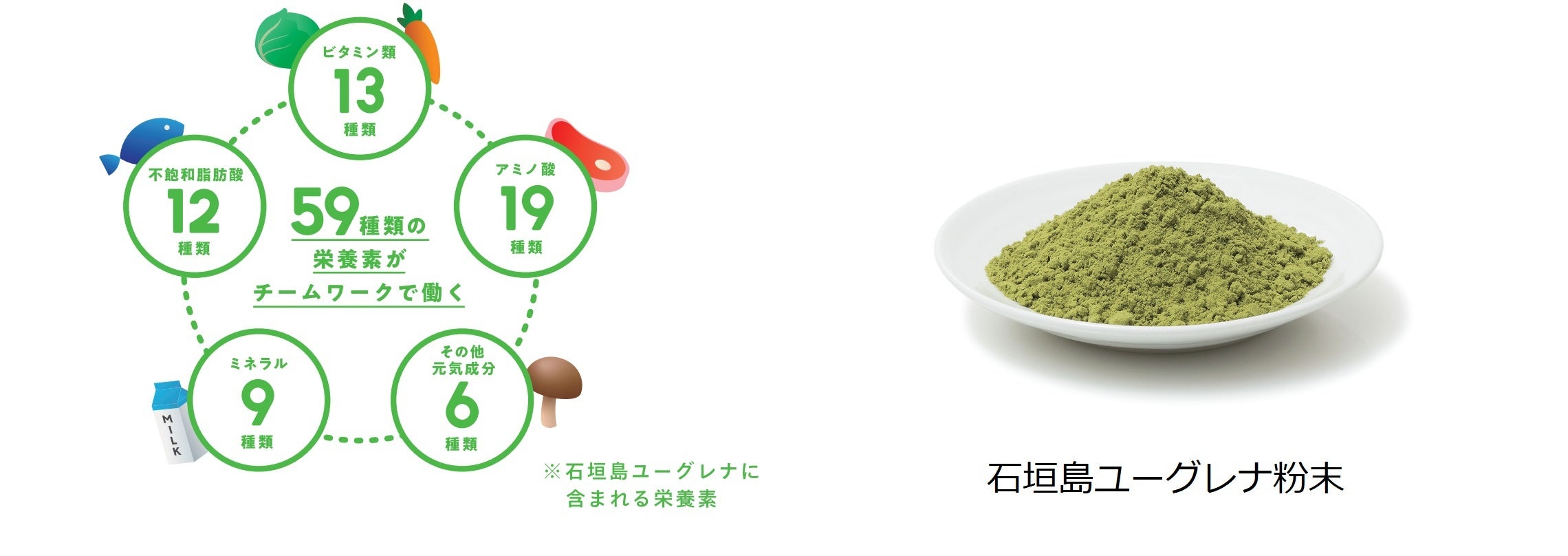 ユーグレナは藻の仲間です。豊かな石垣島の自然で育った石垣島ユーグレナは、人間が必要とする豊富な59種類の栄養素(ビタミン、ミネラル、アミノ酸、DHA、オレイン酸などの不飽和脂肪酸、特有成分パラミロン※1など)を持ち、細胞壁をもたないため、栄養の消化吸収率も高い特長があるスーパーフードです。さらにハラール認証も取得している、食の多様性に対応できるポテンシャルを持っています。また、環境的要素に配慮した責任ある方法で育てられていることが認められ、SDGsの目標14の達成に有効な方法の一つである「ASC-MSC 海藻(藻類)認証」を2019年1月に世界で初めて取得しています。