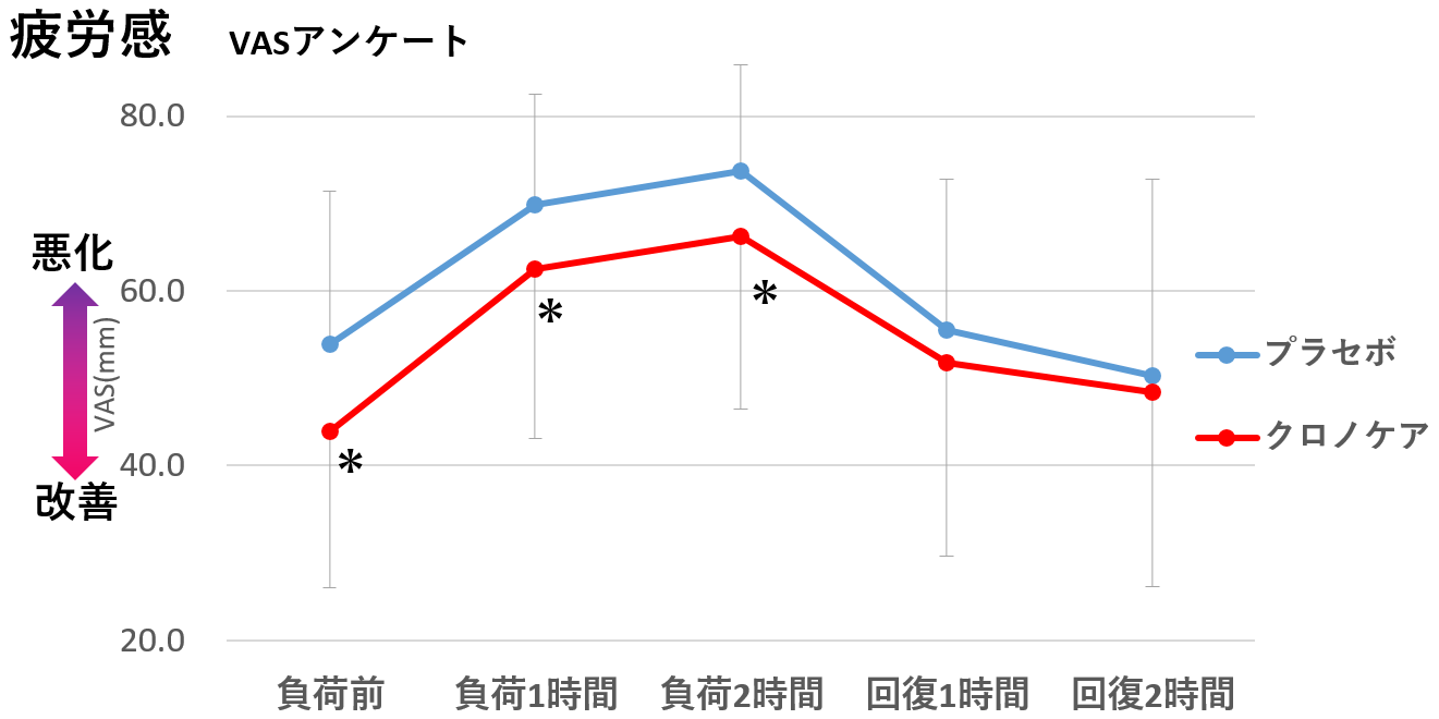 図2:「クロノケア®」100mgを4週間摂取した後の疲労感の変化(パソコン作業負荷2時間)
