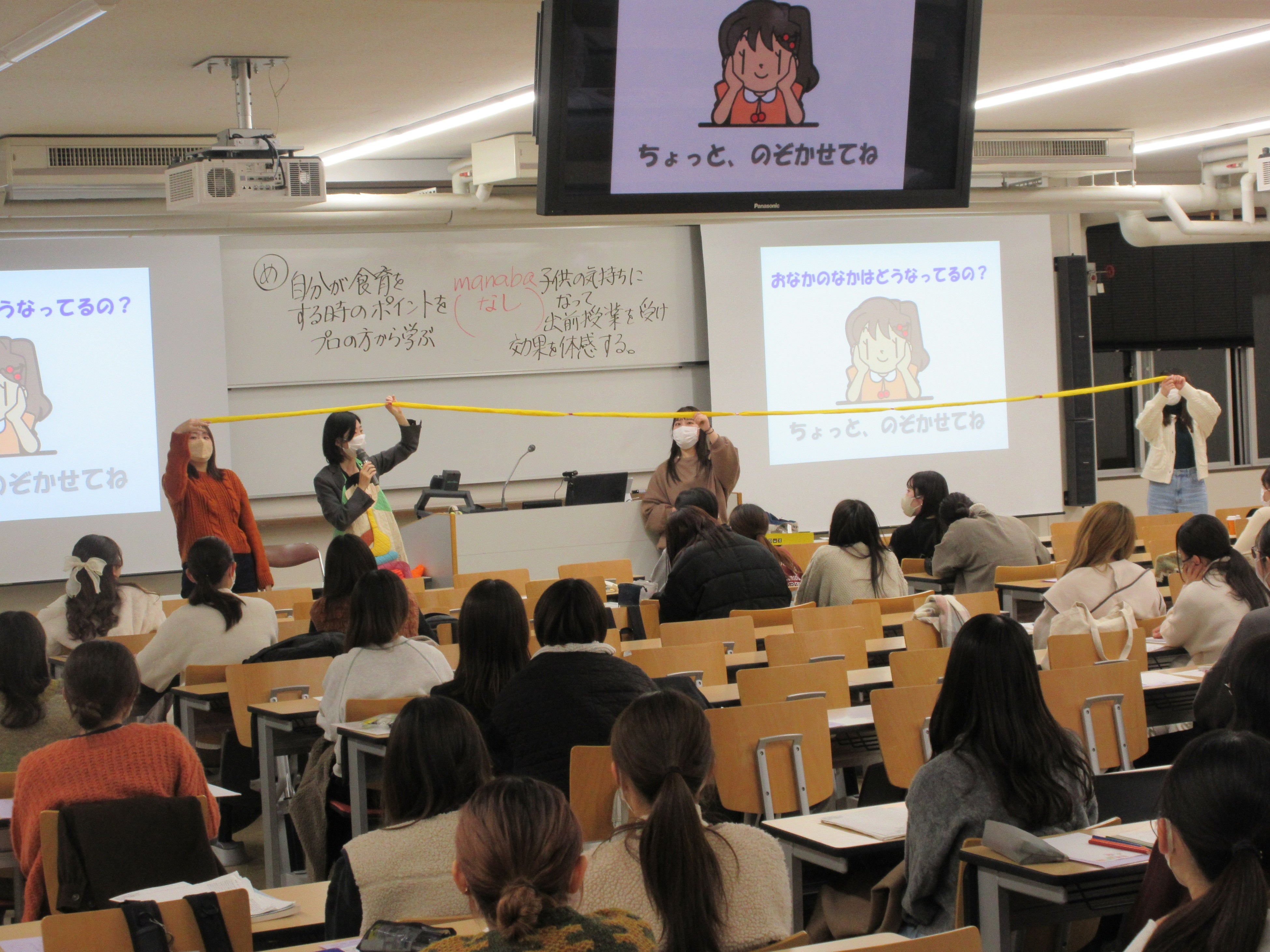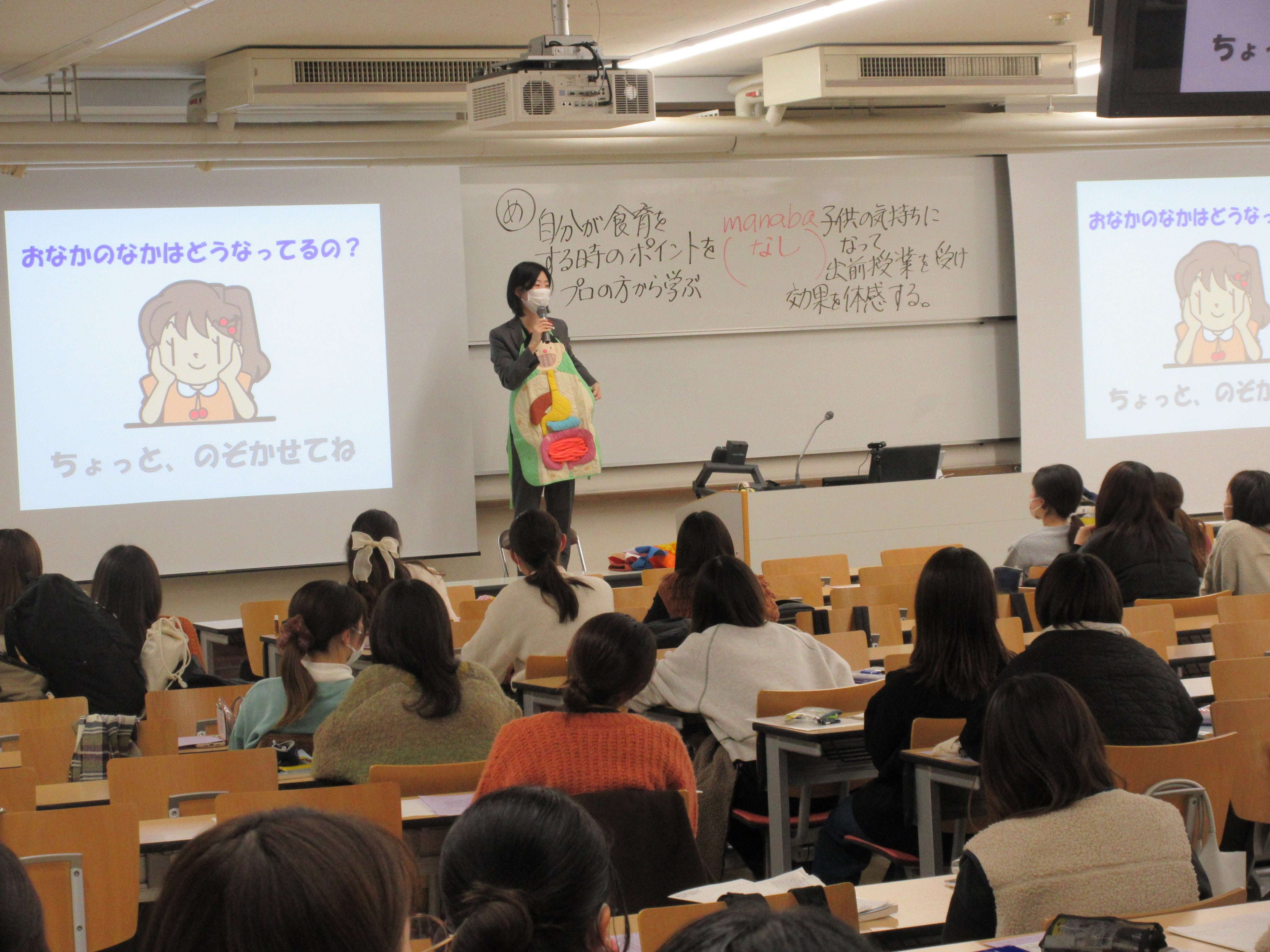 兵庫ヤクルトの管理栄養士で広報担当の浅田麻美子が講座を担当し、文学部教育学科、家政学部の学生を対象に、学校での食育出前授業「おなか元気教室」を体験いただき、さらに企業における管理栄養士の役割、仕事内容をお話ししています。