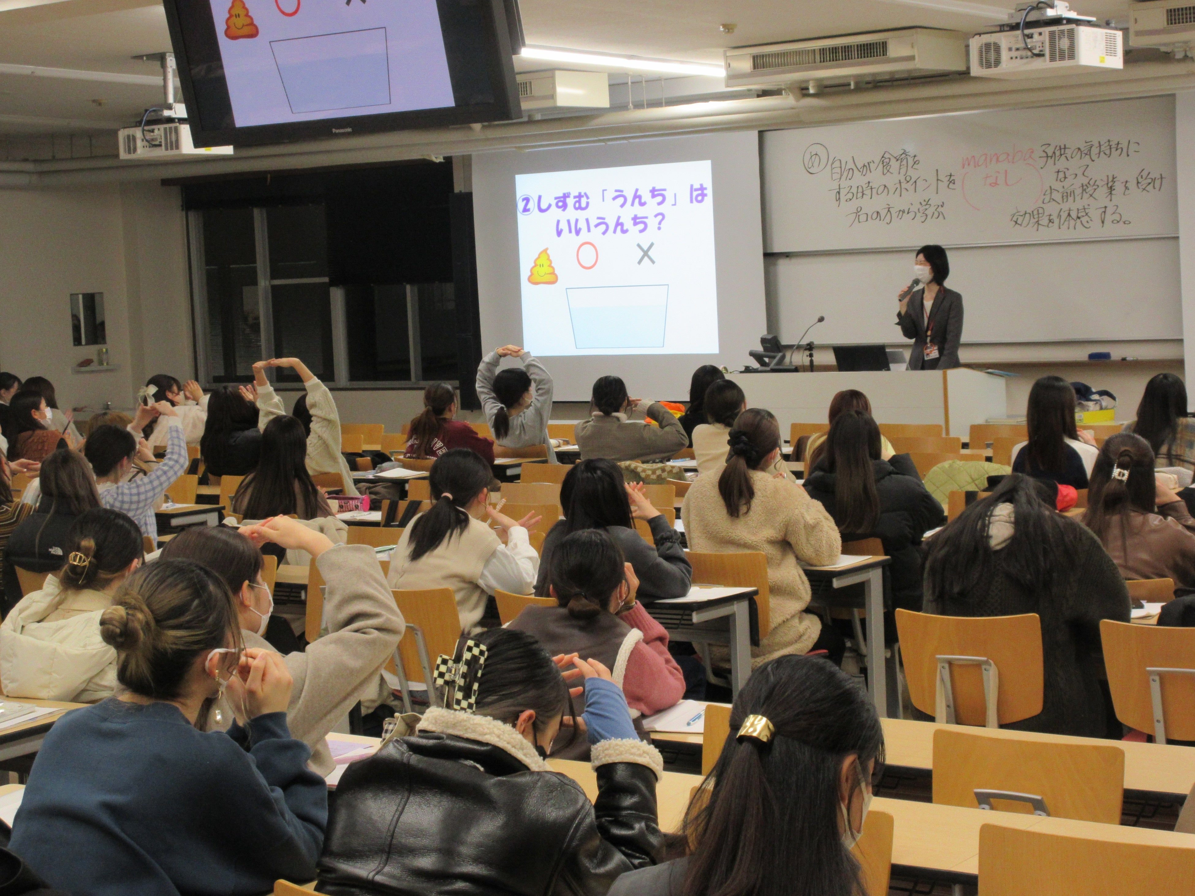 講座の後半は、小学生児童向けに行っている出前授業「おなか元気教室」の模擬授業や解説を行います。受講者は、授業の受け手側の視点で見ることで、教える側の伝え方や様々な授業スタイルの方法を体験いただいています。
