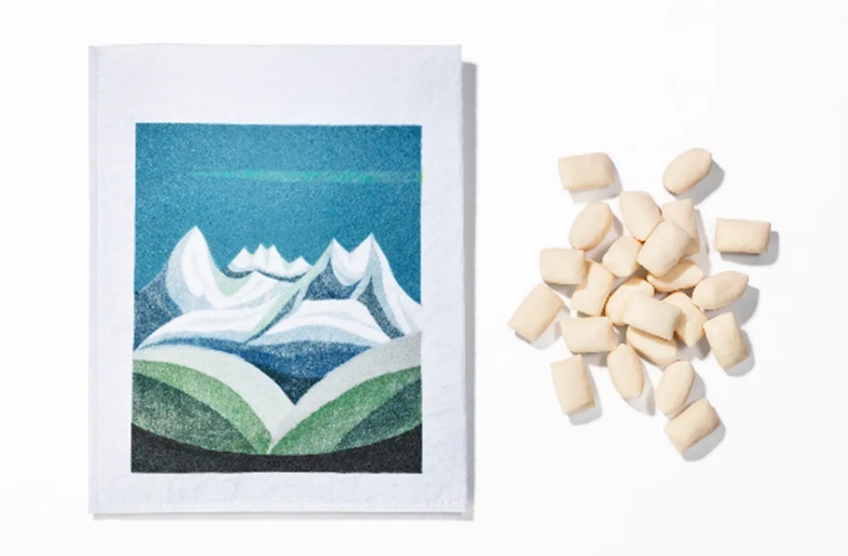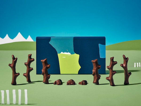 パッケージに美しく並ぶのは、版画家大谷一良さんの作品「森の見る夢」の木々をモチーフにかたどったボンボンで存在感のあるおおきさです。北海道の大自然を目に浮かべながら、満足感のある味わいを楽しめる。