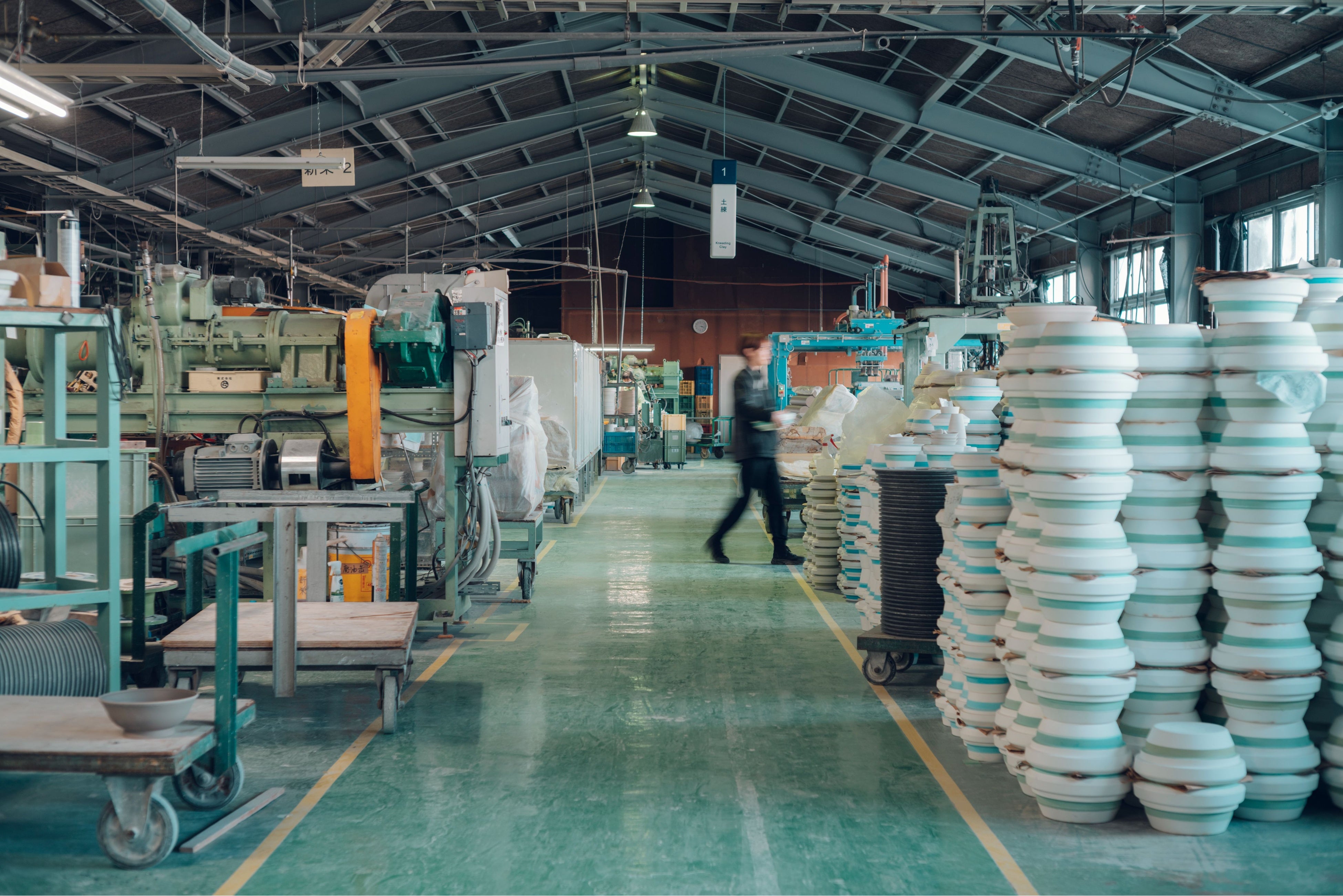 光洋陶器の製造工場を見学することも可能です。人の技と最新のオートメーションの融合により、プロフェッショナル仕様に相応しい品質を保ちながら多品種小ロット生産を実現した、うつわの製造現場ぜひご見学ください。(工場見学は要予約。所要時間50分)